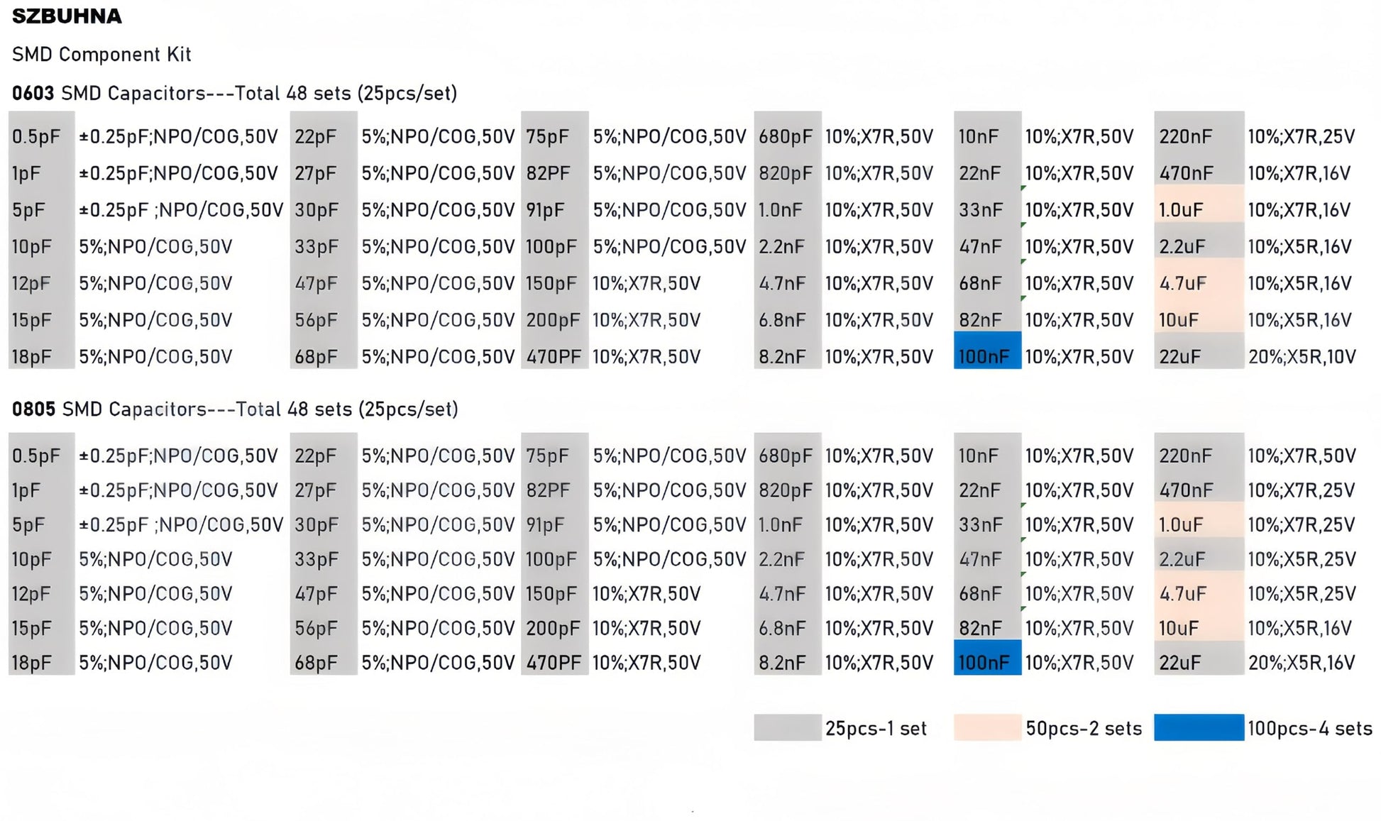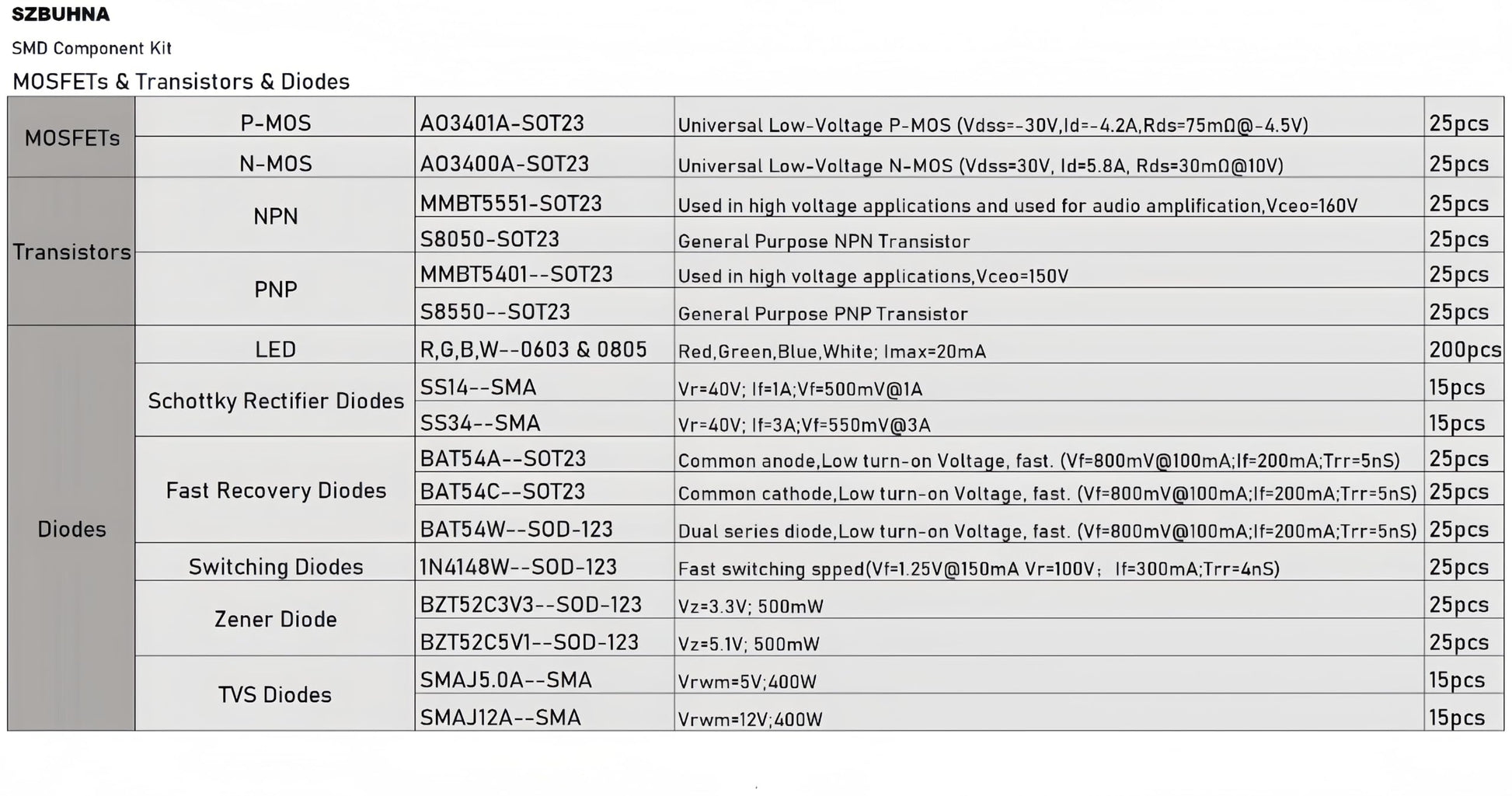 - The SMD Component Kit includes 0603 and 0805 resistors & capacitors, plus essential MOSFETs, BJT transistors, and diodes, total 312 Groups (7760pcs). An comprehensive solution for PCB prototyping and repairs.