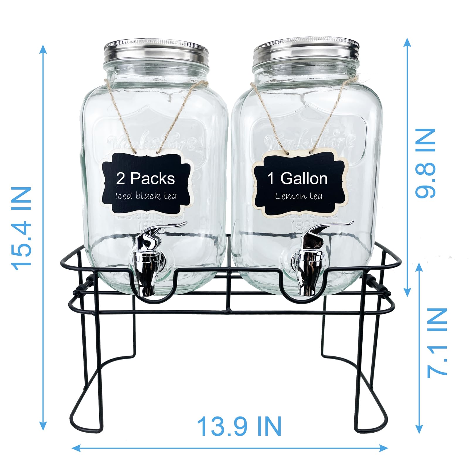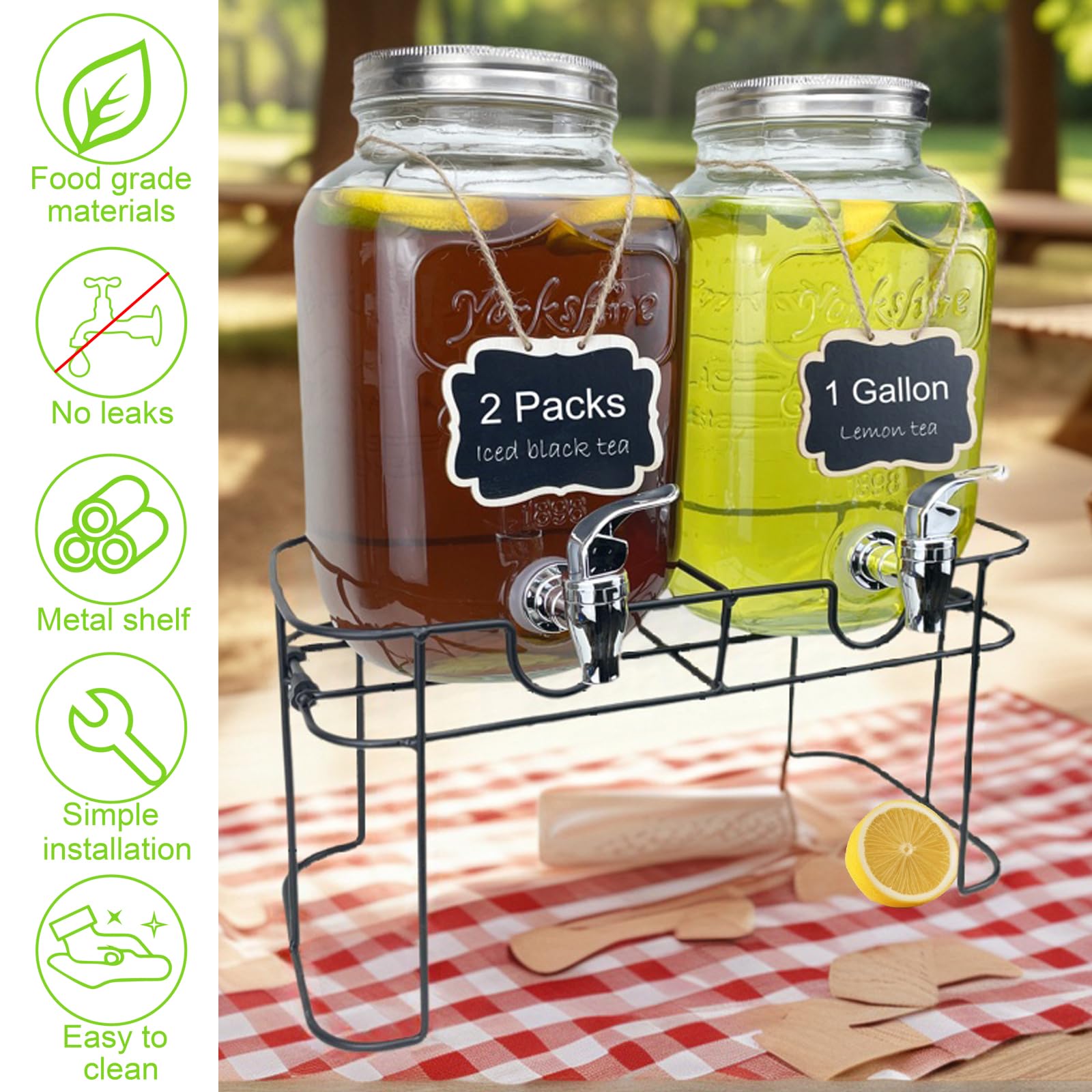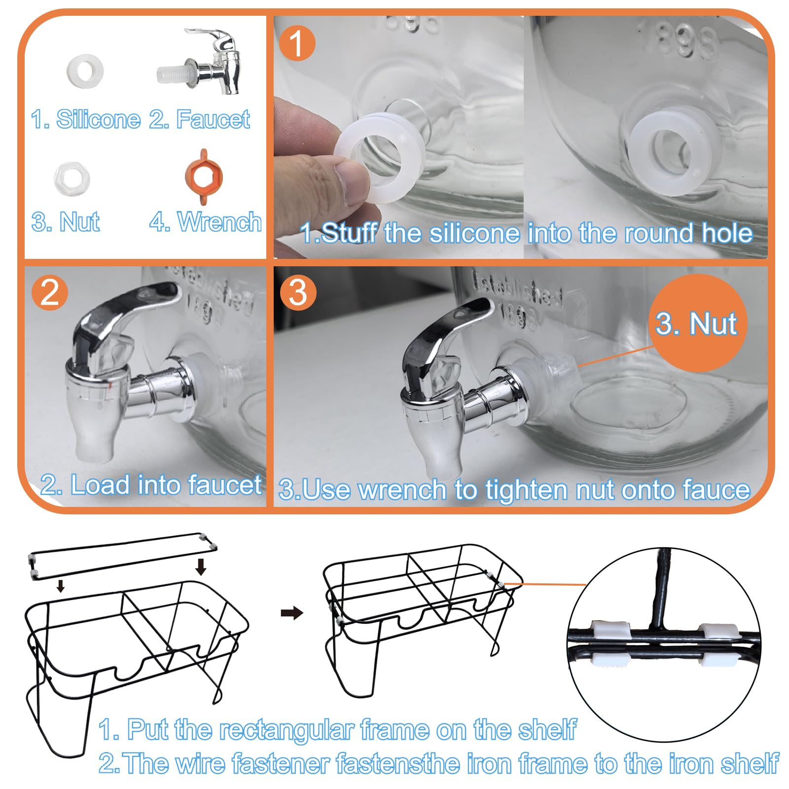 - What You Get: Include 2 x Glass beverage dispenser, 2 x 304 Stainless Steel Cover, 2 x Faucets, 1 x Black Metal Bracket, 1 x Orange Ring Used As A Wrench, 2 x Small Handwriting blackboard