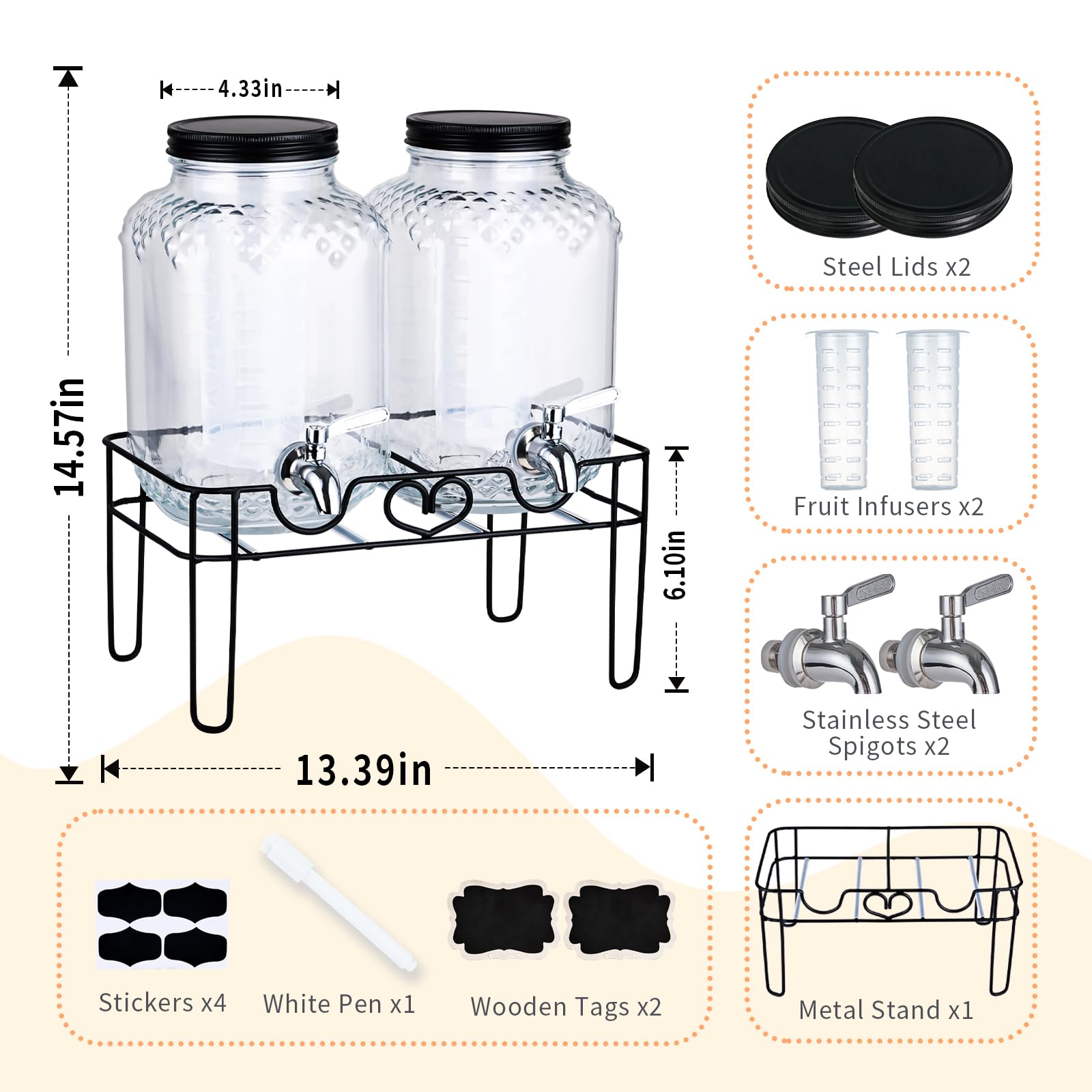 - 【Product Includes】: 2 glass jars with metal lids, 2 fruit infusers, 2 stainless steel spigots, 1 metal stand, 2 wooden tags, 4 stickers, 1 pen, 1 orange wrench, and 1 installation manual.