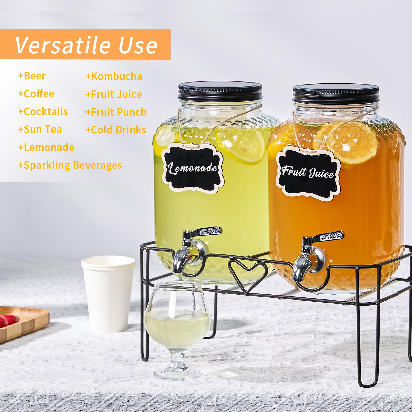 - 【Convenient Design】: Glass drink dispenser comes with a stylish metal bracket that is stable and aesthetically pleasing, and comes with 2 types of labels for you to label drinks on the dispenser. It is an ideal choice for birthday parties, weddings, parties, and Christmas.