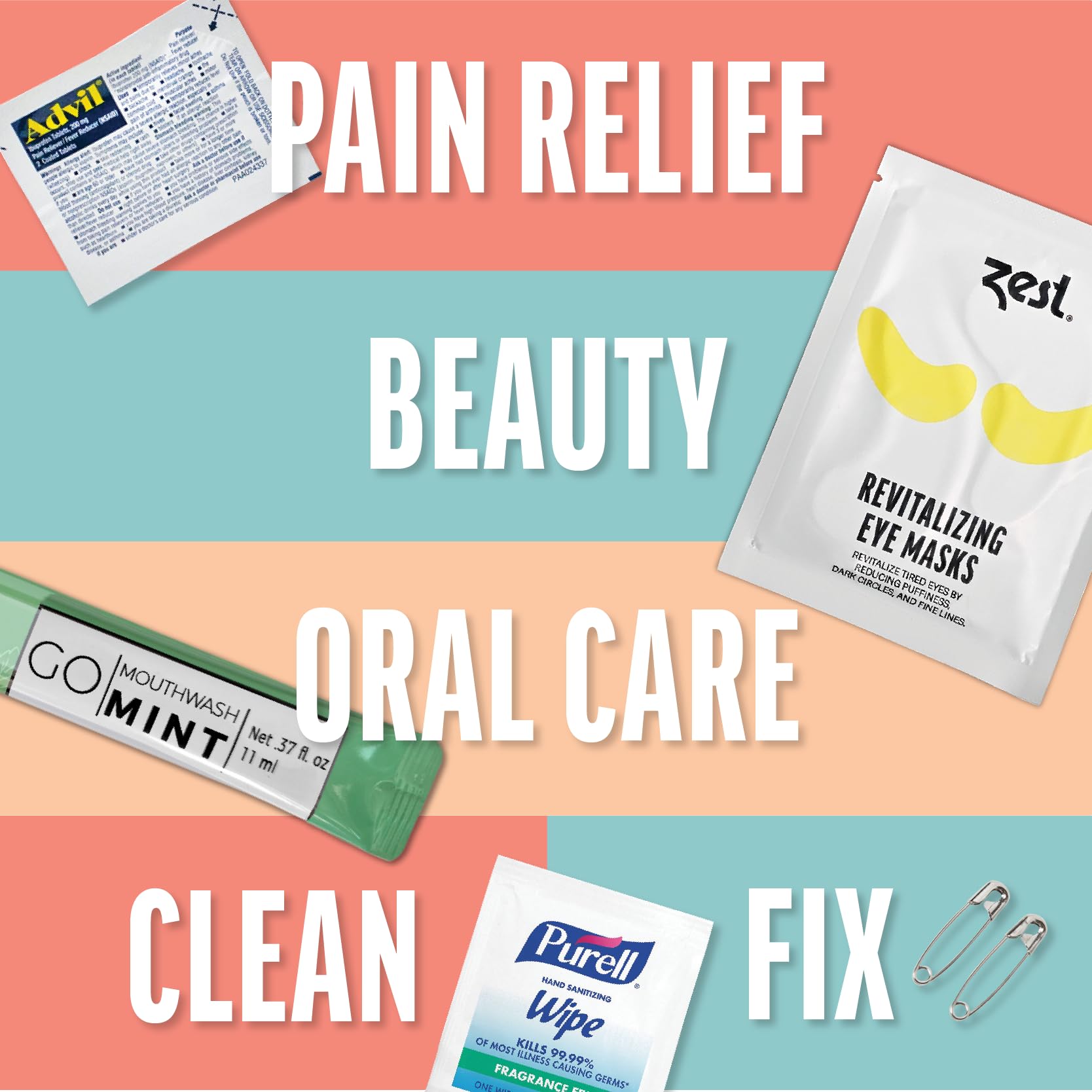 - WHAT'S INSIDE OUR HANGOVER SET BAG: We thought of everything so you don't have to. Our kits are packed with all the things you need: Zest Energy & Focus Hydration Packets, Energy Tea, Ibuprofen, Hand Sanitizer, Mouth Wash, Revitalizing Eye Masks, Make Up Wipes, and Safety Pins.