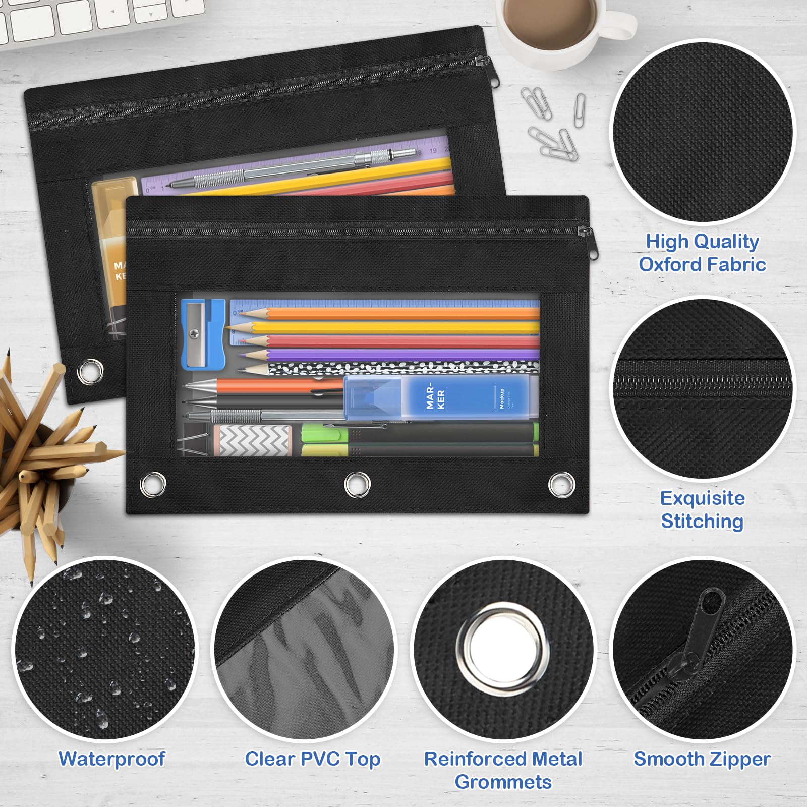 - EXCELLENT QUALITY PENCIL POUCH FOR 3 RING BINDER: AuroTops zipper pencil pouches are durable, well-made, the zippers are solid and move easily, the grommets are secure and not easy to pull out with use, heavily reinforced binder holes, the pockets are made from high quality cloth material nice sturdy waterproof oxford fabric, and strong looking clear PVC for the window which allows you to easily survey what's in the pencil bag. Our clear pencil pouches can hold up for years without any issues.
