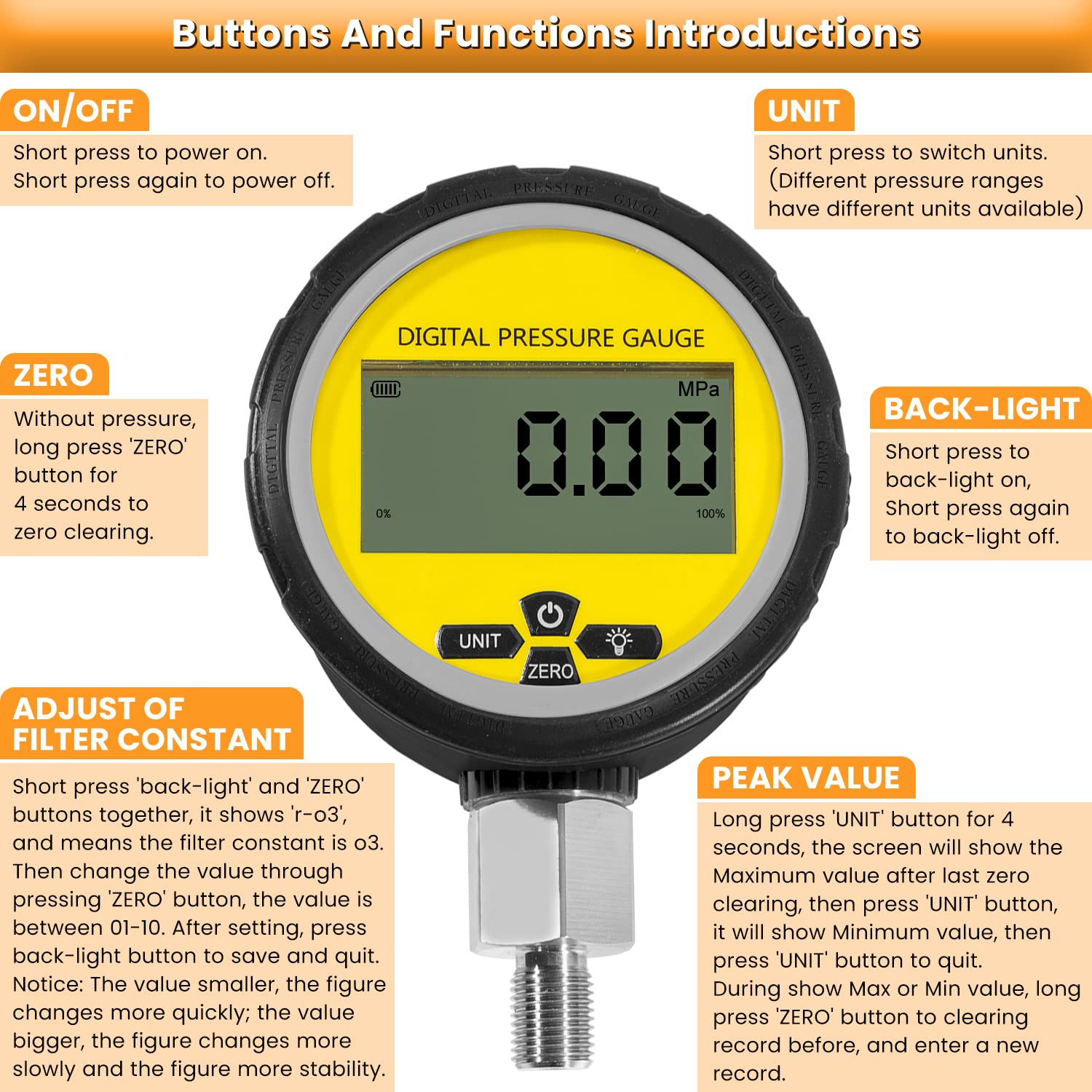 - Package Includes — 1 x Intelligent Digital Pressure Gauge: 0-700BAR/10000PSI/70Mpa | 1 x Black Silicone Protector | 1 x Test Hose 5.2FT/1.6m and 2 x Test Couplings. Gauge Specifications: Connection Thread: NPT1/4 male | Display Unit: Bar, PSI, MPa, Kgf/cm2 | Accuracy: 0.2%FS | Working Temperature: -20C-70C | Input Voltage: 3V (two 1.5V AAA batteries) | Function: On/off, zero clearing, units changing, backlight.