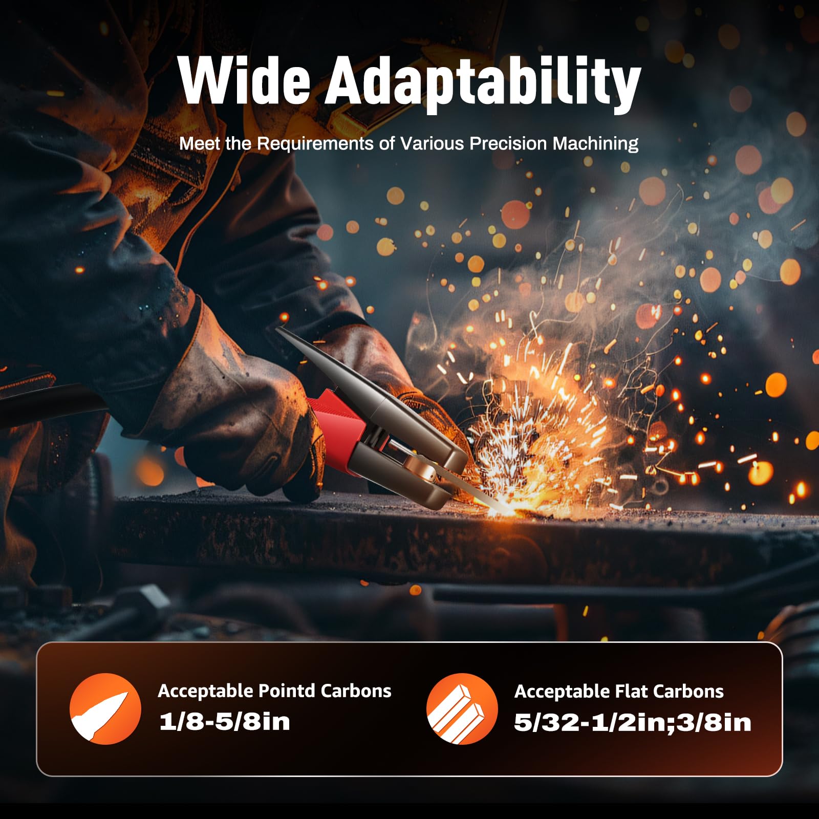 - Accepts pointed carbons 1/8"(3.2mm)To3/8"(10mm),Accepts flat carbons 3/8"(10mm)To5/8"(16mm). You can connect 1/8-5/8-inch pointed carbon or 5/32-1/2-inch or 3/8-inch flat carbon according to your needs as the electrode. The diverse adaptability meets the requirements of various precision machining, demonstrating its flexibility and professionalism.