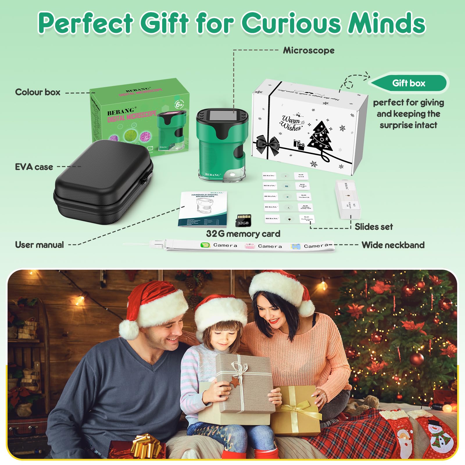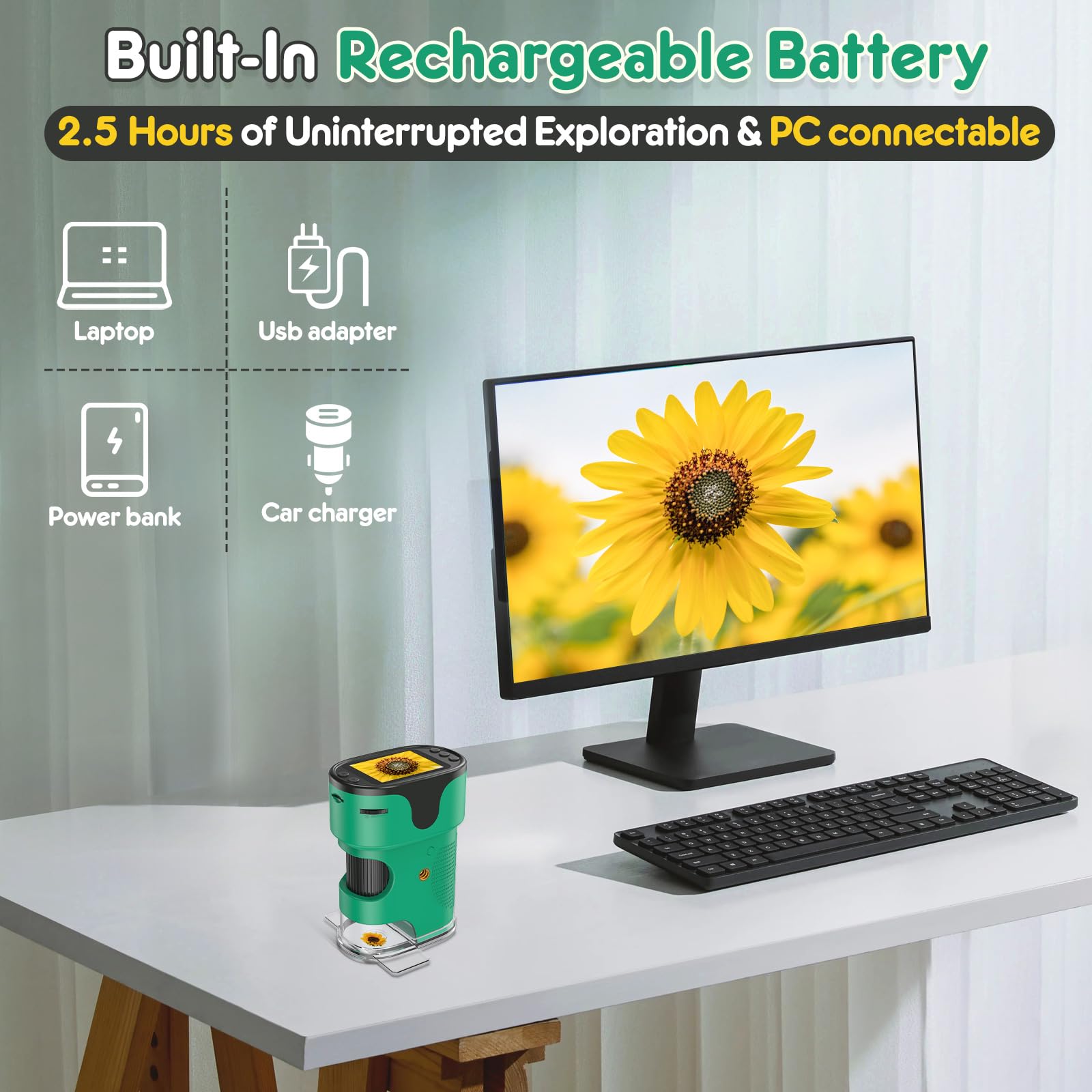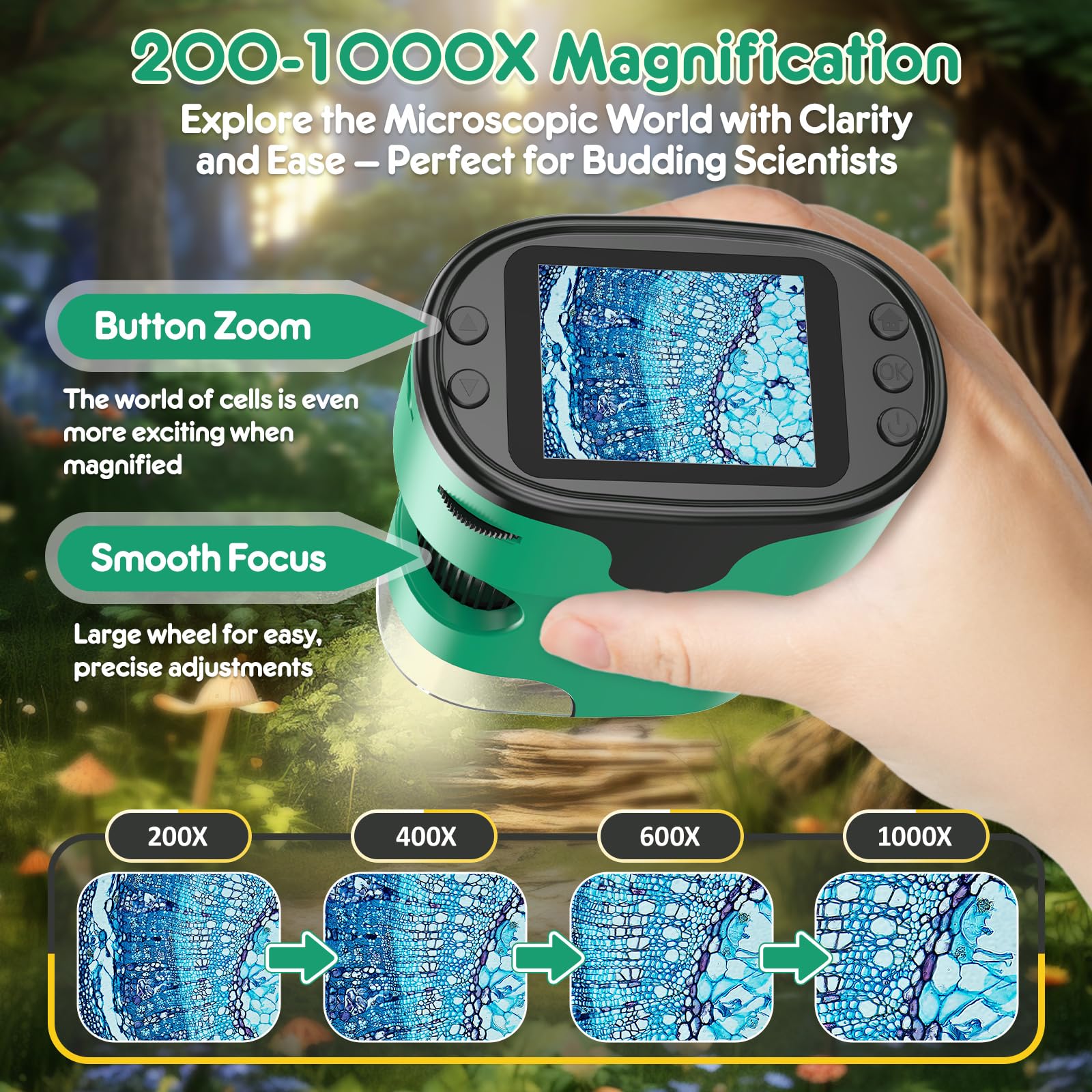 1000X Handheld Microscope for Kids 4K 2.0" Screen Rechargeable Mini Pocket Digital Microscopes w/Slides Kit Portable Edu Gift Age 4-6 8-12 Children Students (Green)