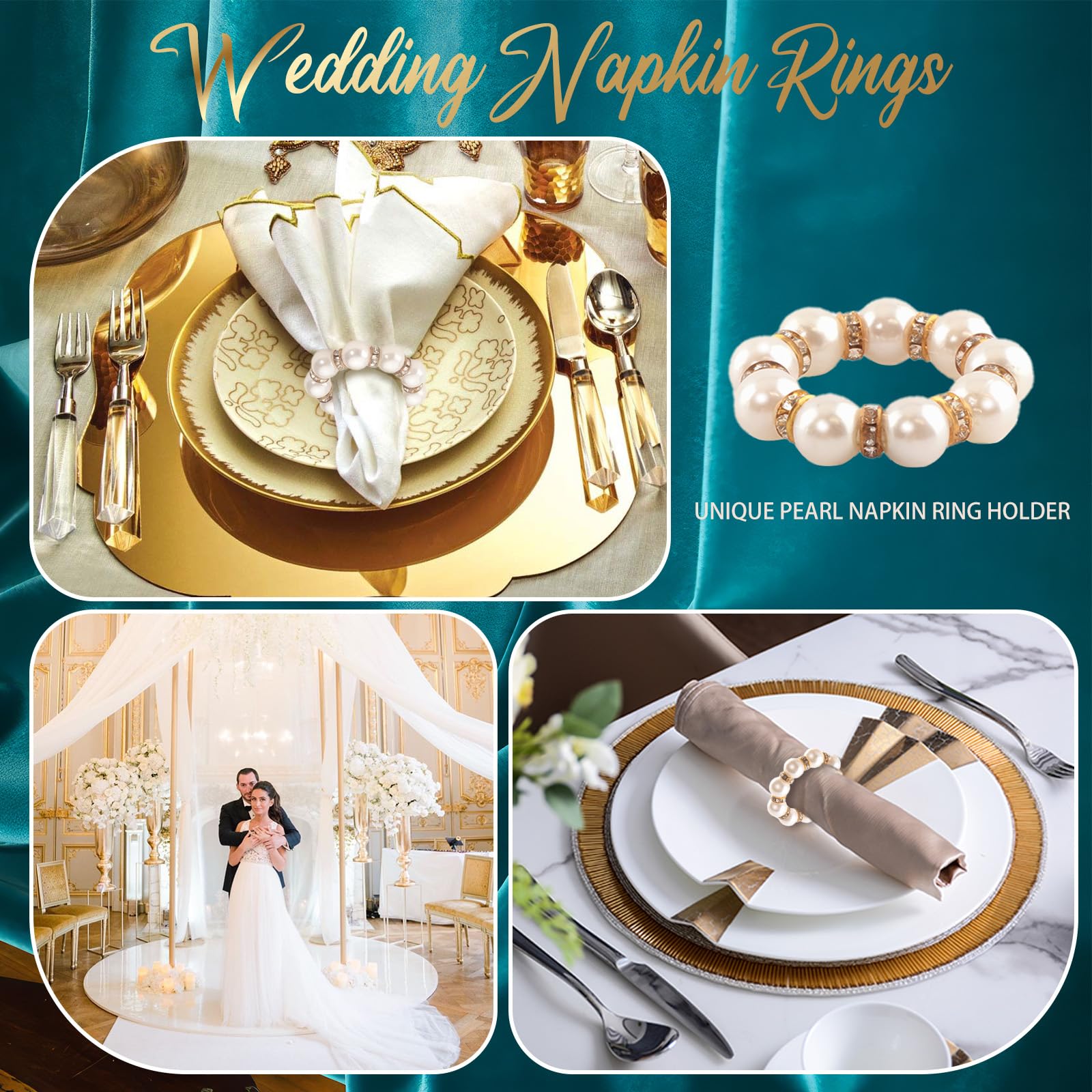 - Suitable Size for Napkins: The size of the gold napkin rings are approx 1.57 inches/ 4 cm in external diameter and approx 0.98 inches/ 2.5 cm in internal diameter, and each pearl is about 0.39 inches/ 1 cm in diameter, which fits most napkins, these napkin rings bulk are simple to put on and take off; No need to struggle or waste time, making your table arrangements quick; Please check the size carefully before ordering