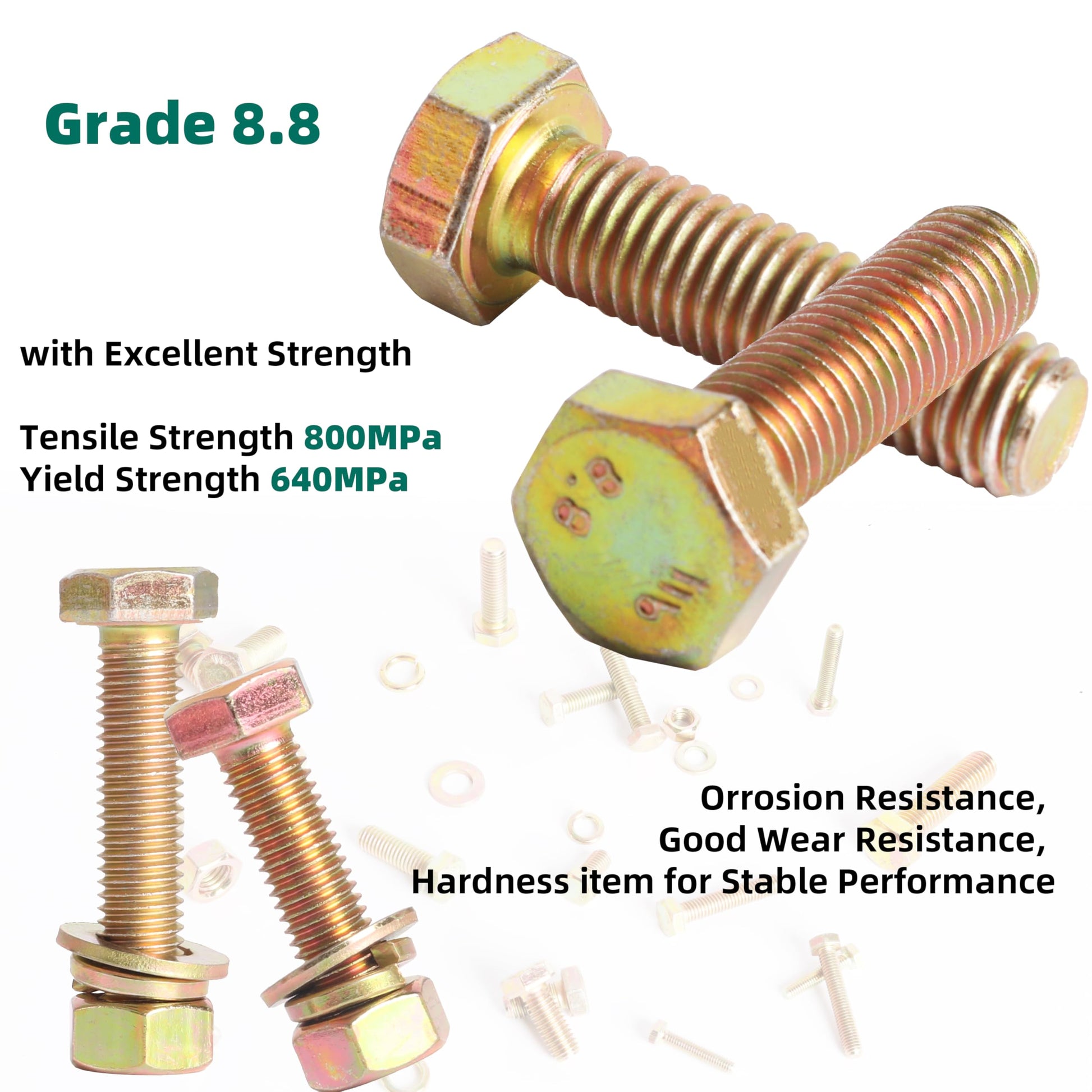 - 【Grade 8.8 Quality Made】Nuts Bolts Assortment Set with excellent Tensile strength and yield strength, tensile strength is 800MPa, yield strength is 640MPa, orrosion resistance, good wear resistance, hardness item for stable performance