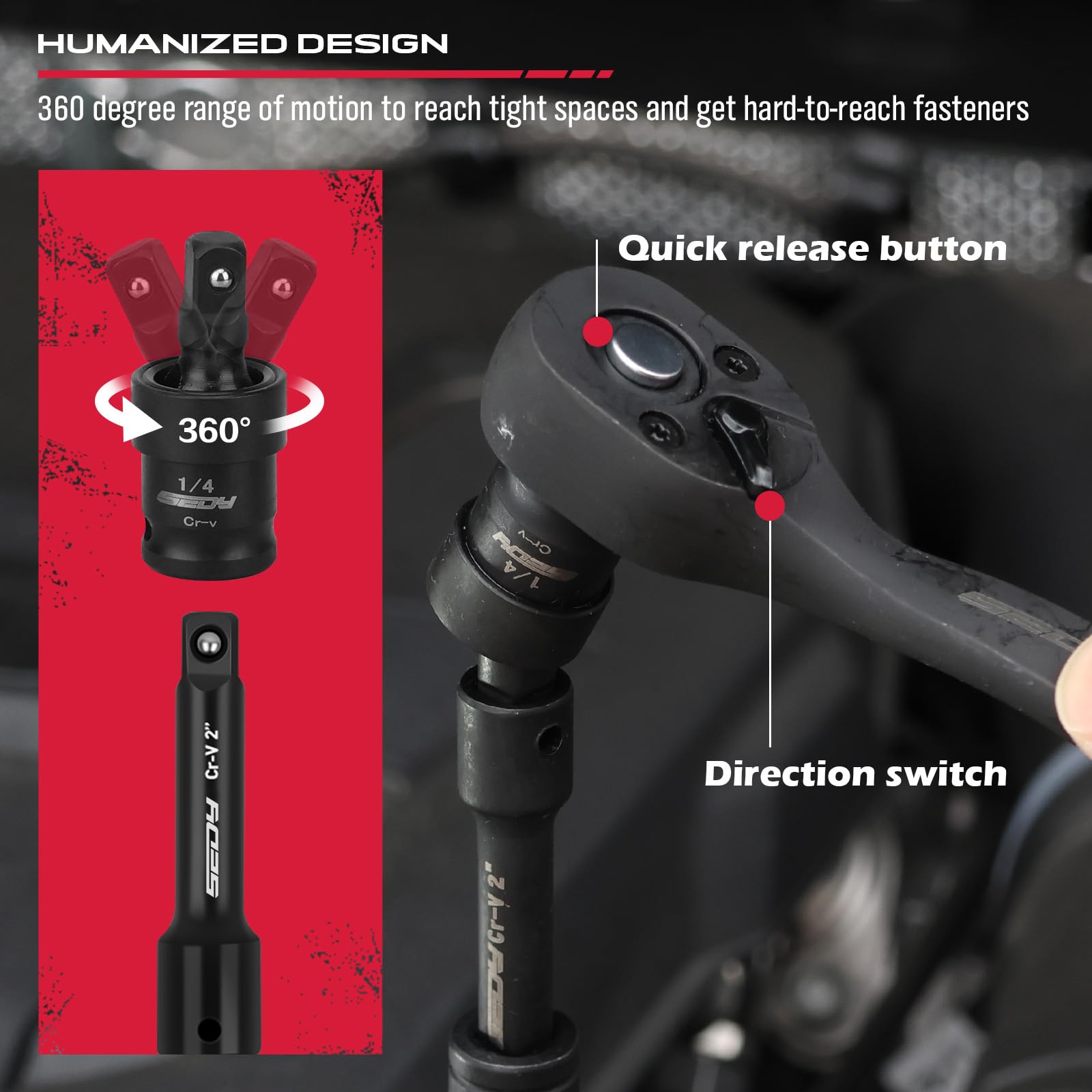 - COMPREHENSIVE TOOL SET — This 105-piece 1/4" drive impact socket set includes SAE (5/32"-9/16") and Metric (4-15mm) sockets, extension bars, adapters, a ratchet wrench handle, universal joint, power bits, screwdriver bits, and a bit holder, making it ideal for automotive and general mechanical repairs