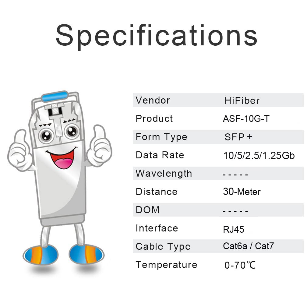 - RJ-45 Connector: 10Gb SFP+ to RJ45 Ethernet Copper Module supports 10 Gigabit over Cat 6a/7/8 cable, up to 30 meters (98ft). It supports 5Gb/2.5Gb/1Gb rate over Cat 5e cable or better,up to 50 meters (164ft)