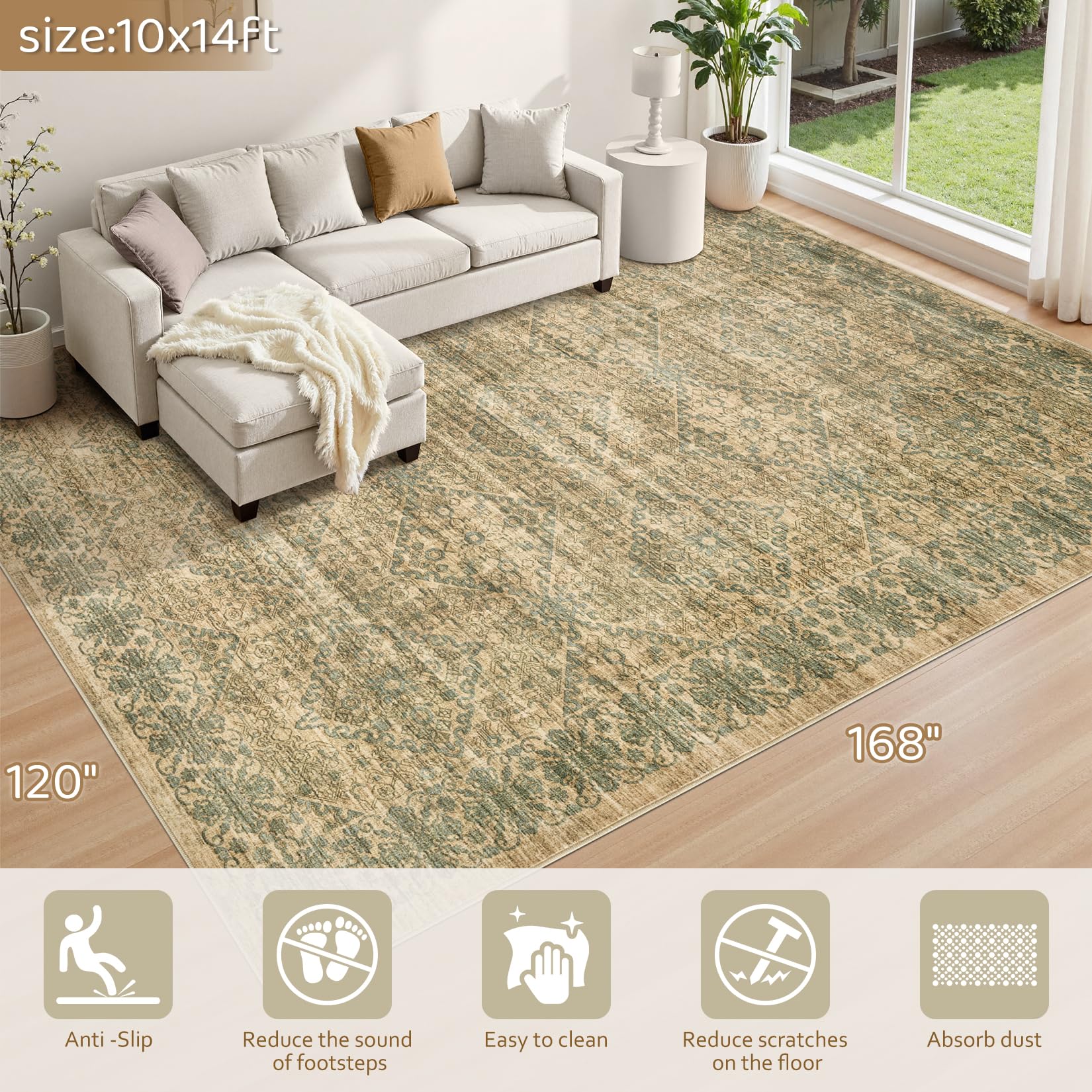 10x14 Area Rug Living Room: Washable Neutral Vintage Large Rugs Non-Slip Stain Resistant Soft Low Pile Indoor Retro Carpet for Bedroom Dining Room Under Table Office Playroom - Brown