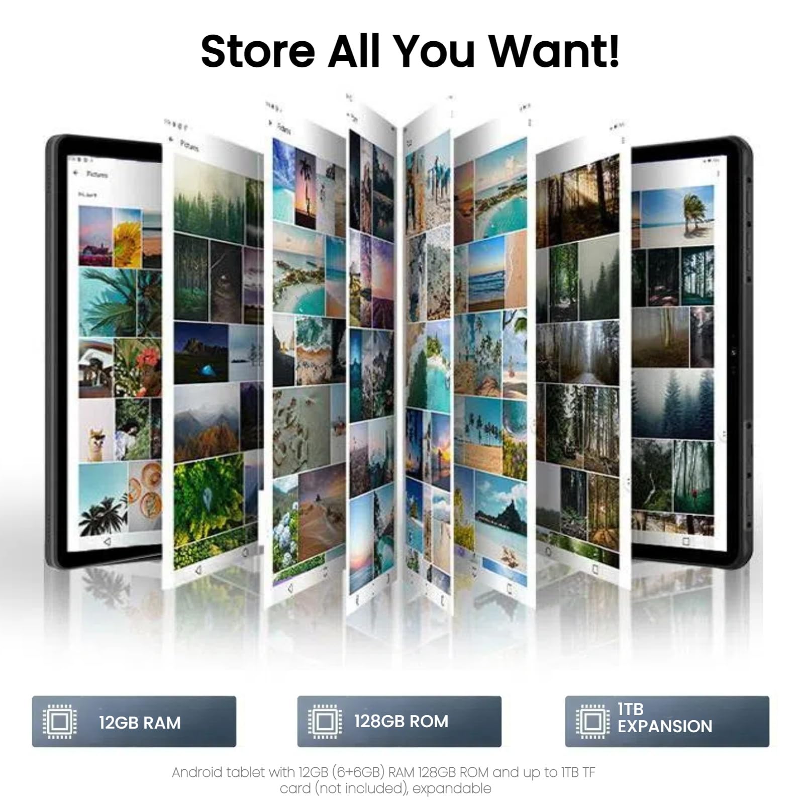 - 【12GB RAM+128GB ROM+1TB Expansion】Android 14 tablet is equipped with 12GB RAM+128GB ROM+1TB expansion. With GMS certification, you can download and install any application APP, which can meet your various needs in daily use. Besides, tablet supports Widevine L1 & GPS FM function, which allows you to smoothly watch copyrighted content such as high-quality HD content and streaming services on Prime video, DISNEP, Hulu, etc. It also supports wireless projection and can easily connect to a large TV.
