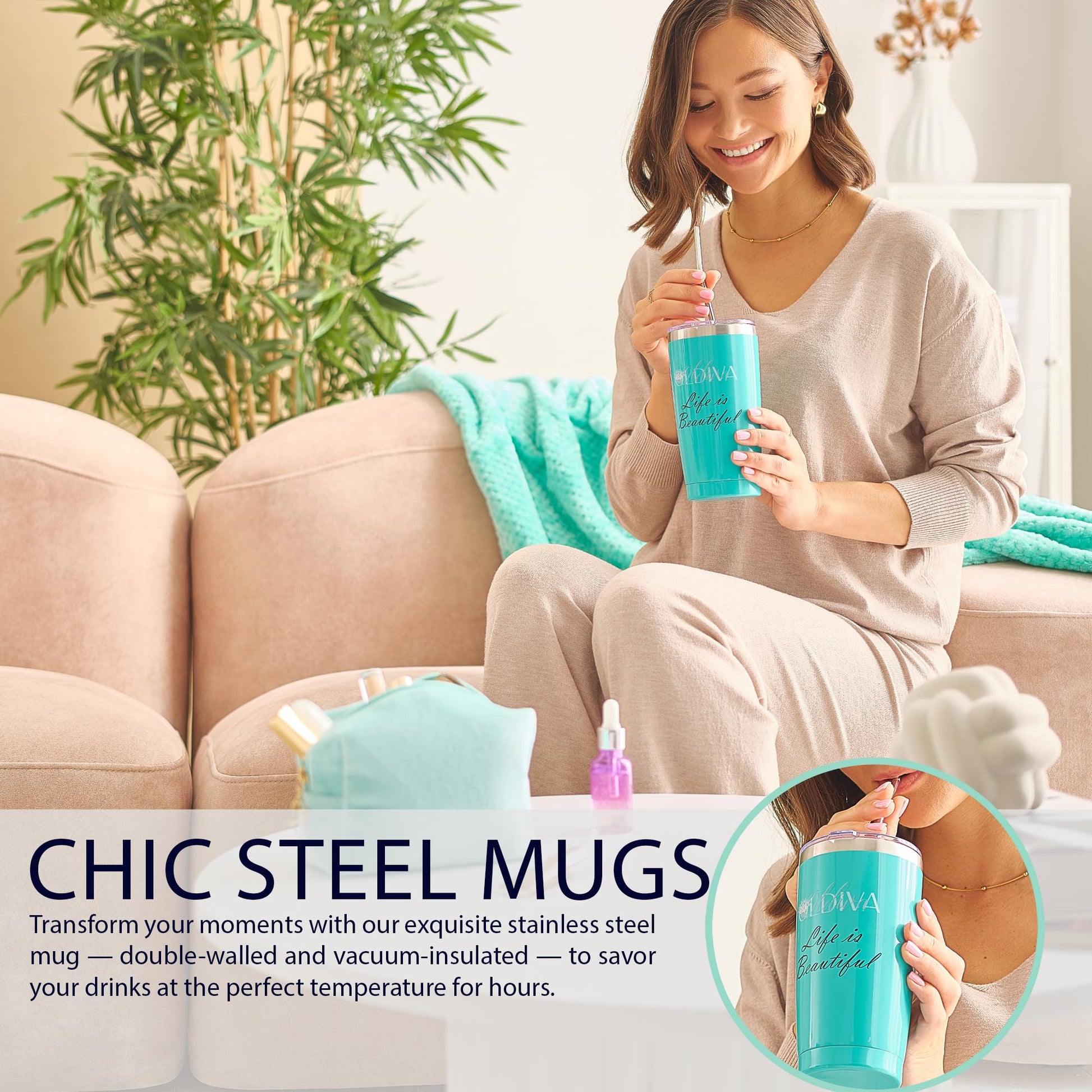 - 11-Piece Chic Ocean Blue Spa Gift Set: Includes a fluffy throw blanket, fuzzy socks, coffee, water tumbler, plus bath care items she’ll love! Bath salts, bar soap, shower steamers and a scented candle packed in the cosmetic bag help to create a spa retreat either at home or during travel! And, a lovely greeting card helps you tell her how special she is!