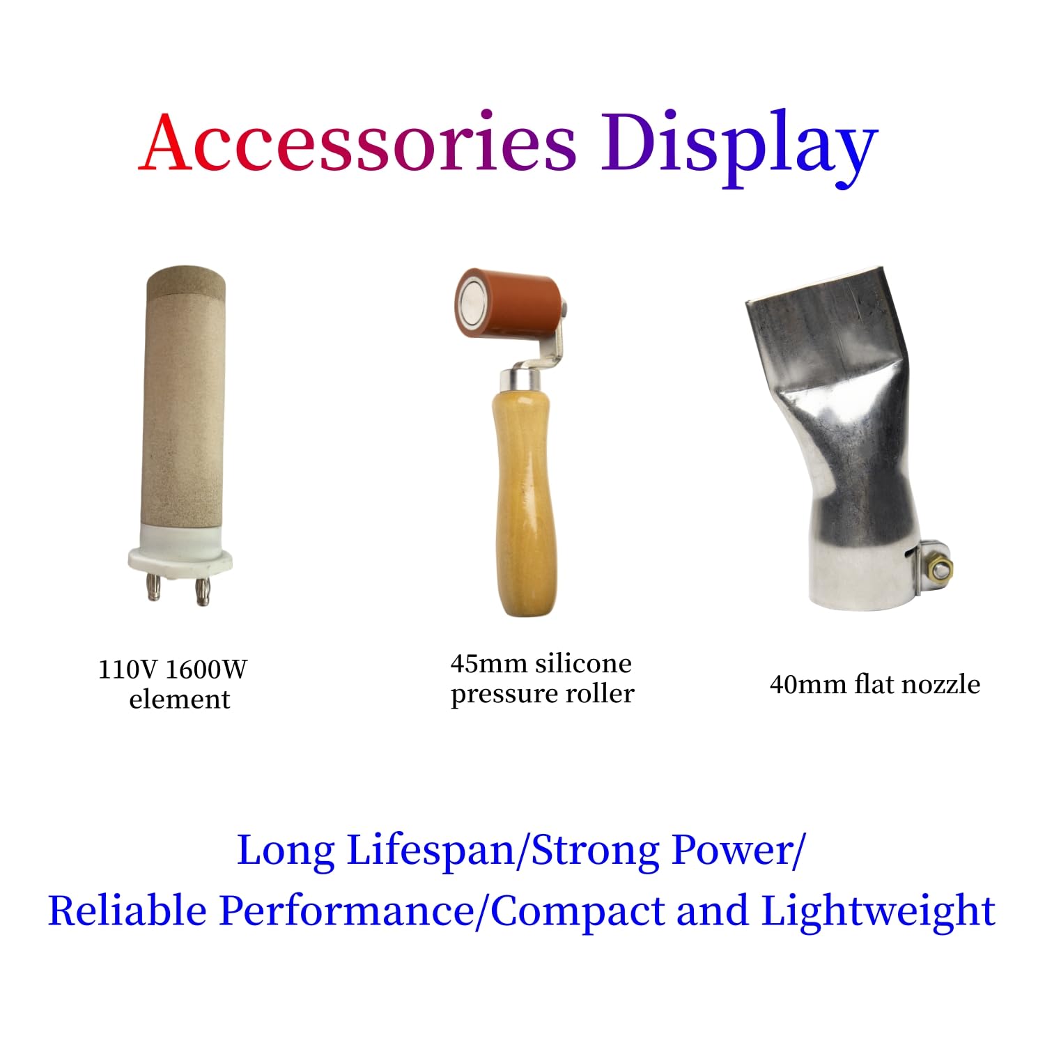 - [Package Include]: 110V 1600W hot air plastic welder gun*1; 40mm silicone pressure roller*1; 1600w heat element*1; 40mm flat nozzle*1.
