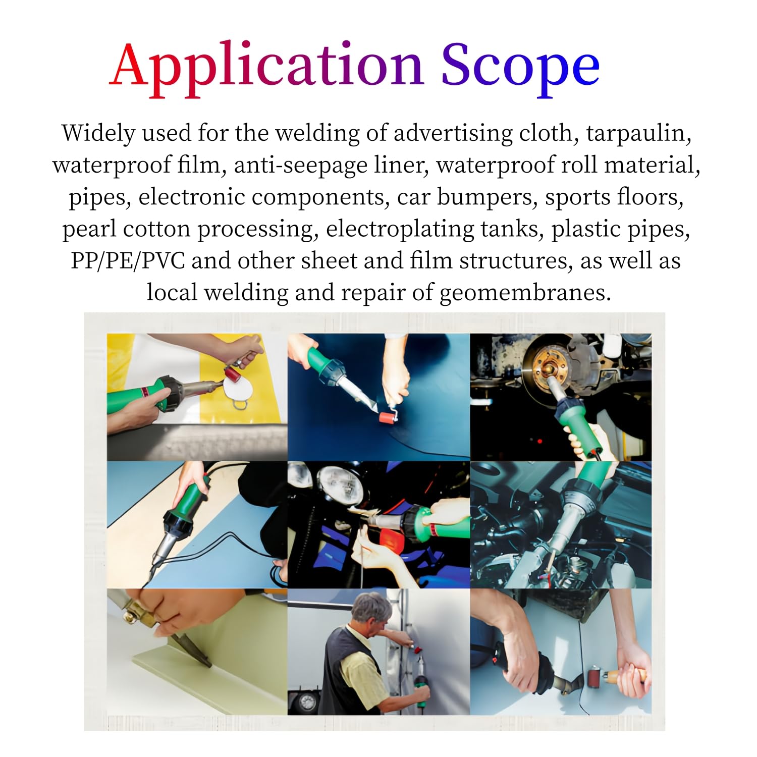 - [Application Scope]: Widely used for the welding of advertising cloth, tarpaulin, waterproof film, anti-seepage liner, waterproof roll, pipeline, electronic components, car bumper, sports floor, pearl cotton processing, electroplating tank, plastic pipe, PP/PE/PVC and other sheet and film structures, as well as the welding and repair of geomembranes.