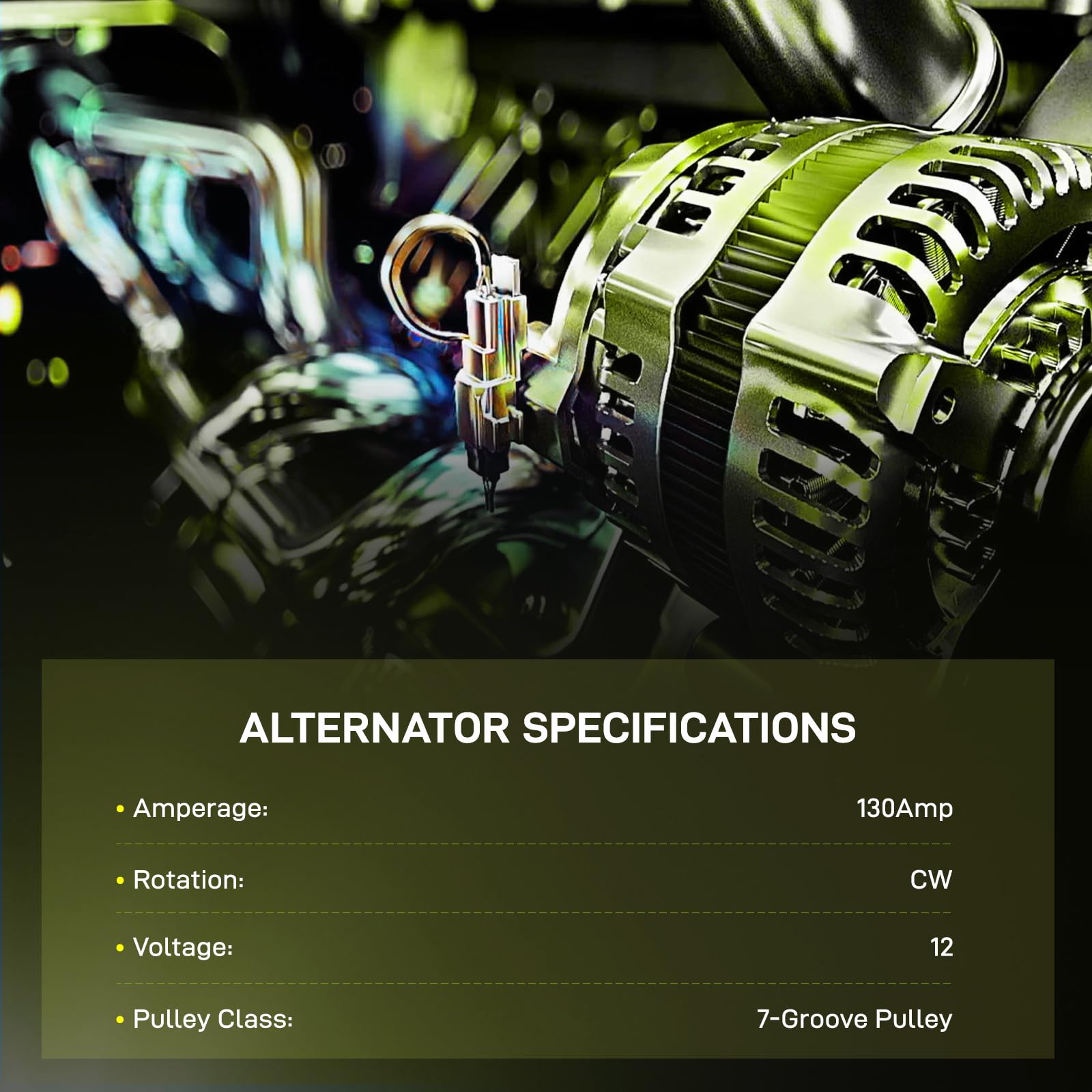 - 【Specifications】automotive replacement alternators details: Condition: New, Regulator/Fan: IR/IF, Voltage: 12V, Amperage: 130A, Rotation: Clockwise, Number of Grooves: 7-Groove Pulley, Pulley Class: SD7, Plug Code: 295