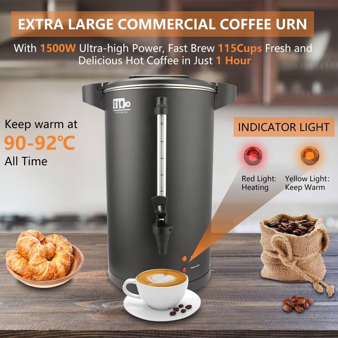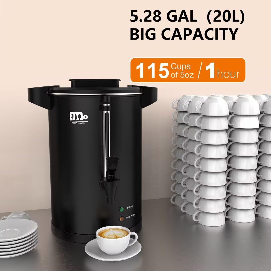 - ☕【SERVING 115 CUPS FOR A CROWD】 If you regularly make coffee for large groups of people, it's time to consider investing in a fully functional coffee maker! This commercial coffee urn is built with 1500W/110-120V power to make you brew coffee quickly without losing rich flavor. 20L capacity, equivalent to 115 cups of 5oz coffee. Ideal for caterers,restaurants,churches,schools,health care facilities,offices,shops,gatherings and buffet. Perfect for tea,hot chocolate,coffee or other hot drink.