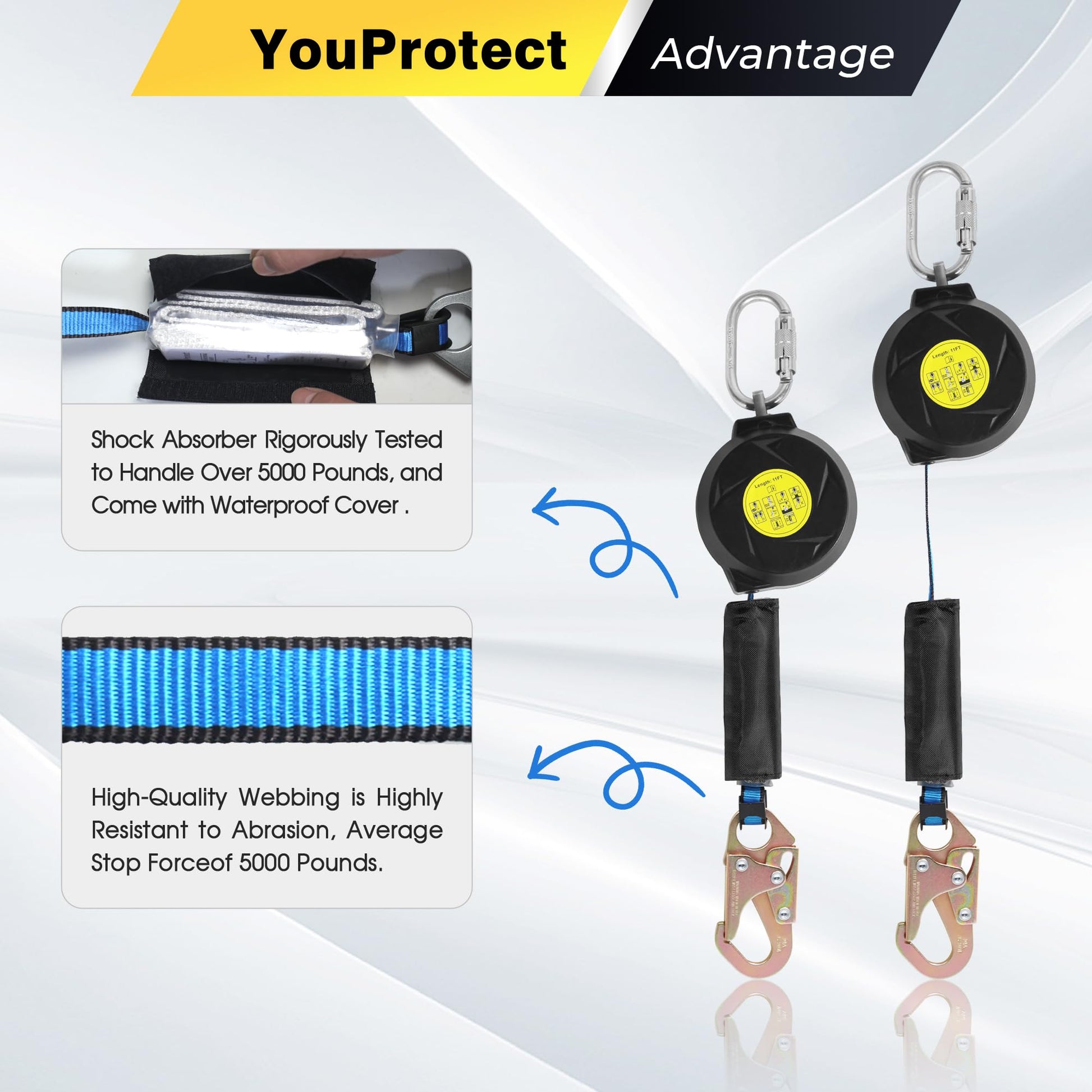 - EXTERNAL SHOCK ABSORBER:The lanyard shock absorbers, rigorously tested to handle over 5,000 pounds, If you stumble or fall, the shock absorber releases immediately, reducing acceleration and lessening the impact, drastically lowering the risk of harm or worse. This shock pack with protective cover on it to better preserve shock pack