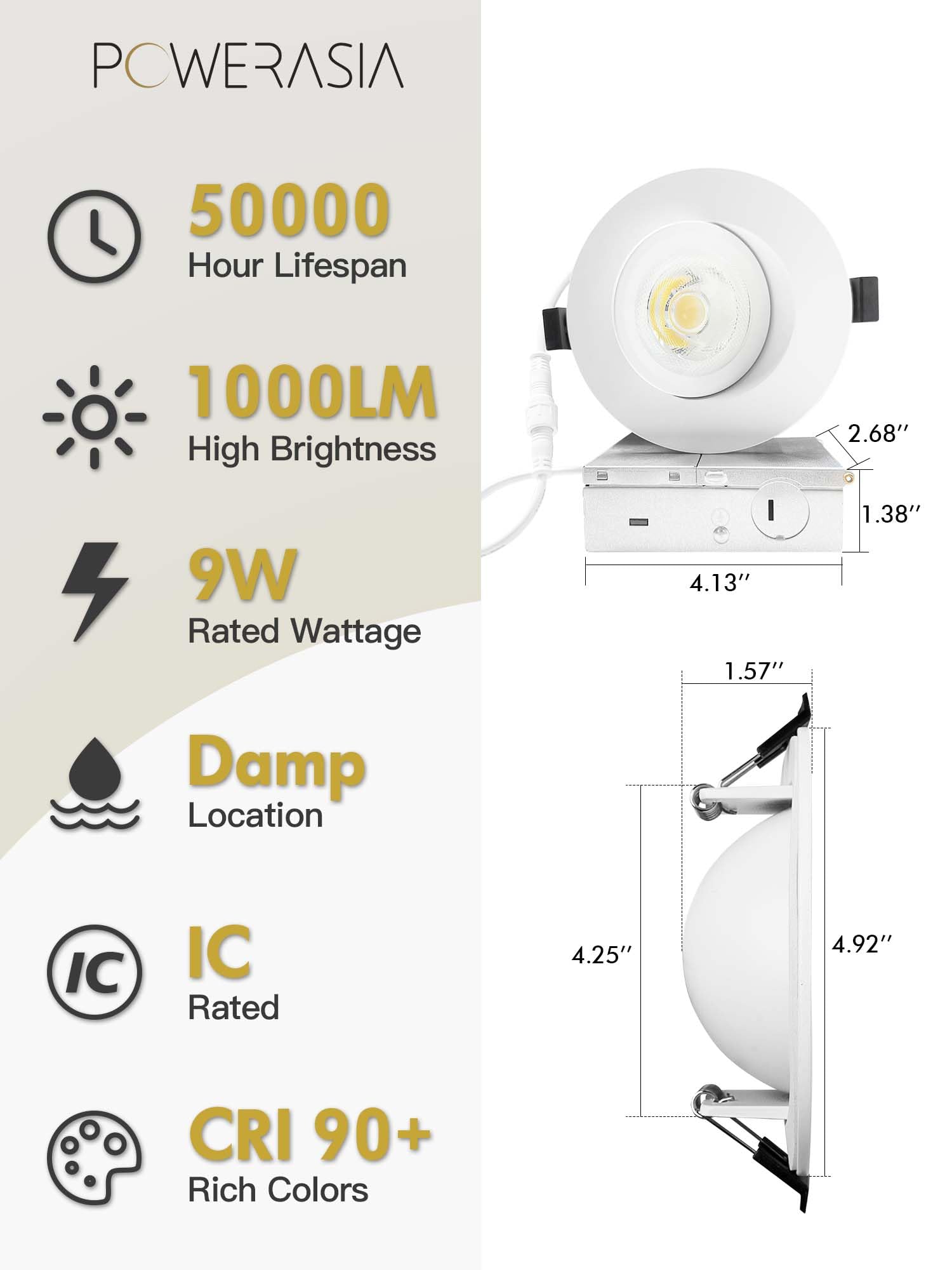 - 💡【High Brightness】 POWERASIA 90+CRI technology brings true color rendering to your house. The 6 inch led recessed light use the new generation of LED chips with higher lumens and lower power. 1000LM 9 Watts, which equals to 110W incandescent lamp, saving you up to 88% in energy costs.