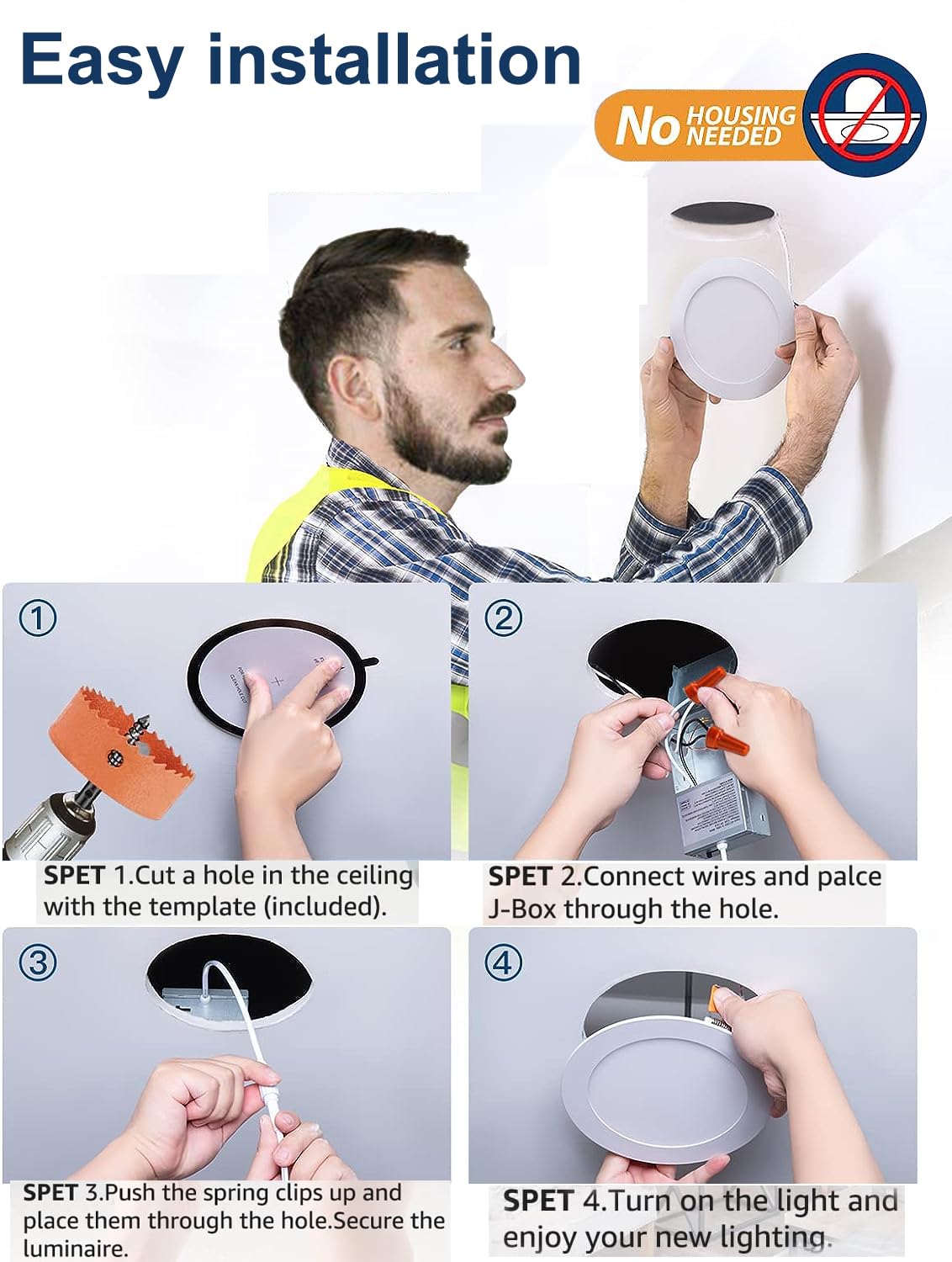 - 💡 Easy to install: Low profile embedded lighting is suitable for renovation and new decoration: use drilling tools to drill a 155mm diameter hole in the ceiling; Connect the junction box to the cable; Secure it to the ceiling with a safety clip. No trouble, installation can be completed in just a few minutes.
