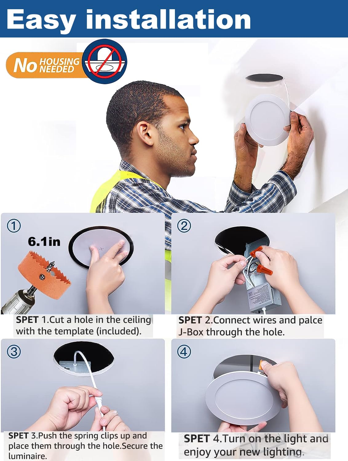 - 💡【Easy Install】The low profile recessed lighting is suitable for retrofit and new decoration: Cut a hole in ceiling with Using a 6.1 inch (155mm) diameter hole opener; Connect the Jbox to the cable; Use spring clip to fix it on the ceiling. Hassle-free, the installation can be completed in minutes.