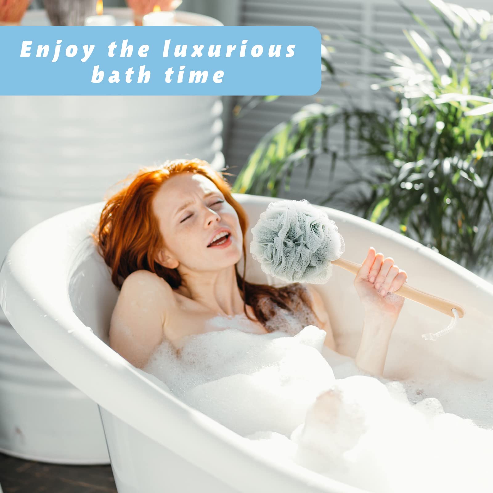 - Reliable Material: the bath part of this back scrubber for shower for women is made of PE material, which is soft, can dry quickly after being exposed to water, so it is convenient for daily storage; The handle is made of wood, which feels good and is not easy to bend when using; The bath ball is firmly combined with the wooden handle, so don't worry the bath ball falling off easily