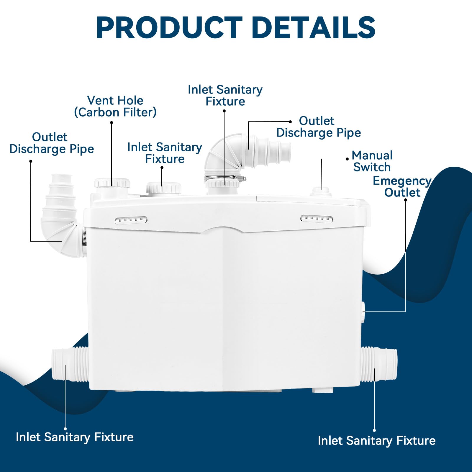 - LOWER NOISE AND SECURE : Operating at just 45 dB, this sink sewage pump runs quietly and smoothly, ensuring no disruption to your sleep.. New External exhaust valve keeps odors trapped outside, (Or an 1/2-inch venting pipe connected if needed). Crafted from premium PP material, the outer shell is resistant to aging and scratches, making it easy to clean. With an IPX4 waterproof design, this pump is built to last even in tough conditions