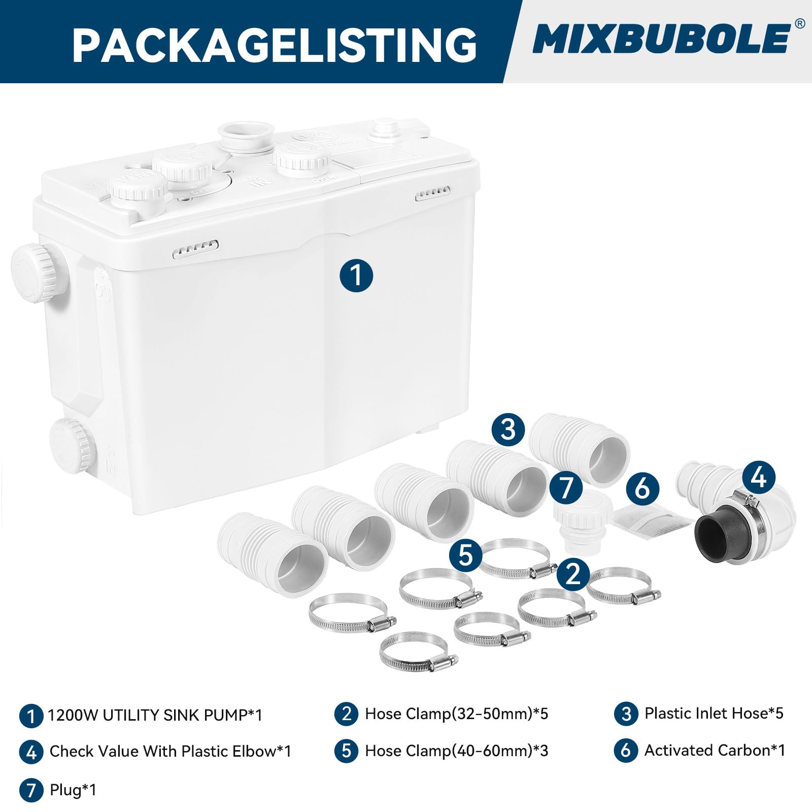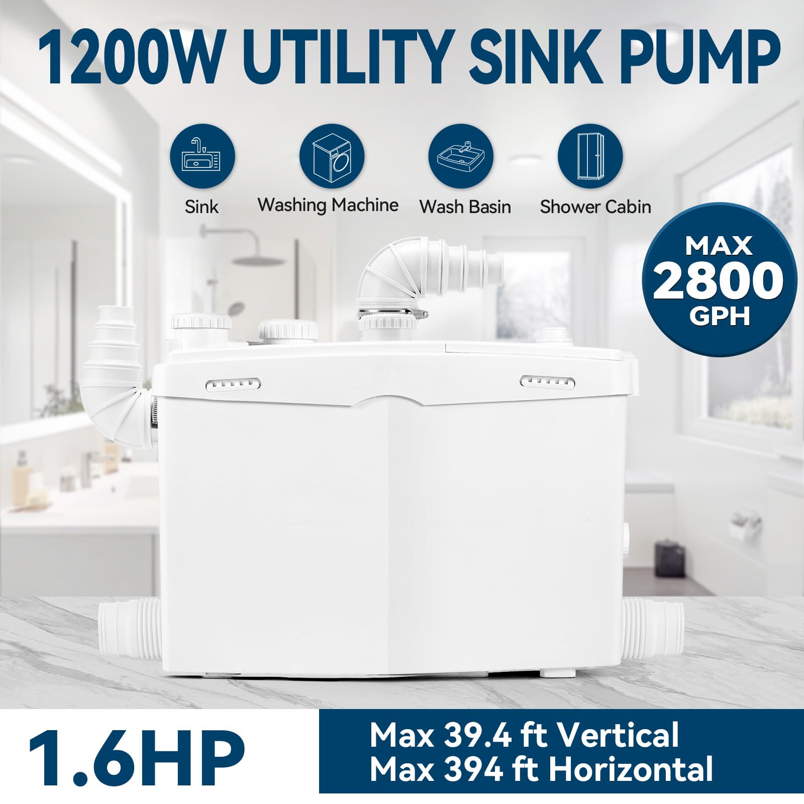 - FULLY AUTOMATIC UTILITY SINK PUMP : 1200W | 110V-120V/60Hz | 39.4 ft Vertical/394 ft Horizontal | 7000 RMP. Designed for home use, the MIXBUBOLE Macerator Pump effectively pumps clear wastewater without solid contents to a nearby outlet where gravity drainage is not feasible. And a flow rate of up to 2800 GPH, it is ideally suited for off-grid residential sewage systems.It provides a full bathroom solution for house renovation without big modifications to the sewage system