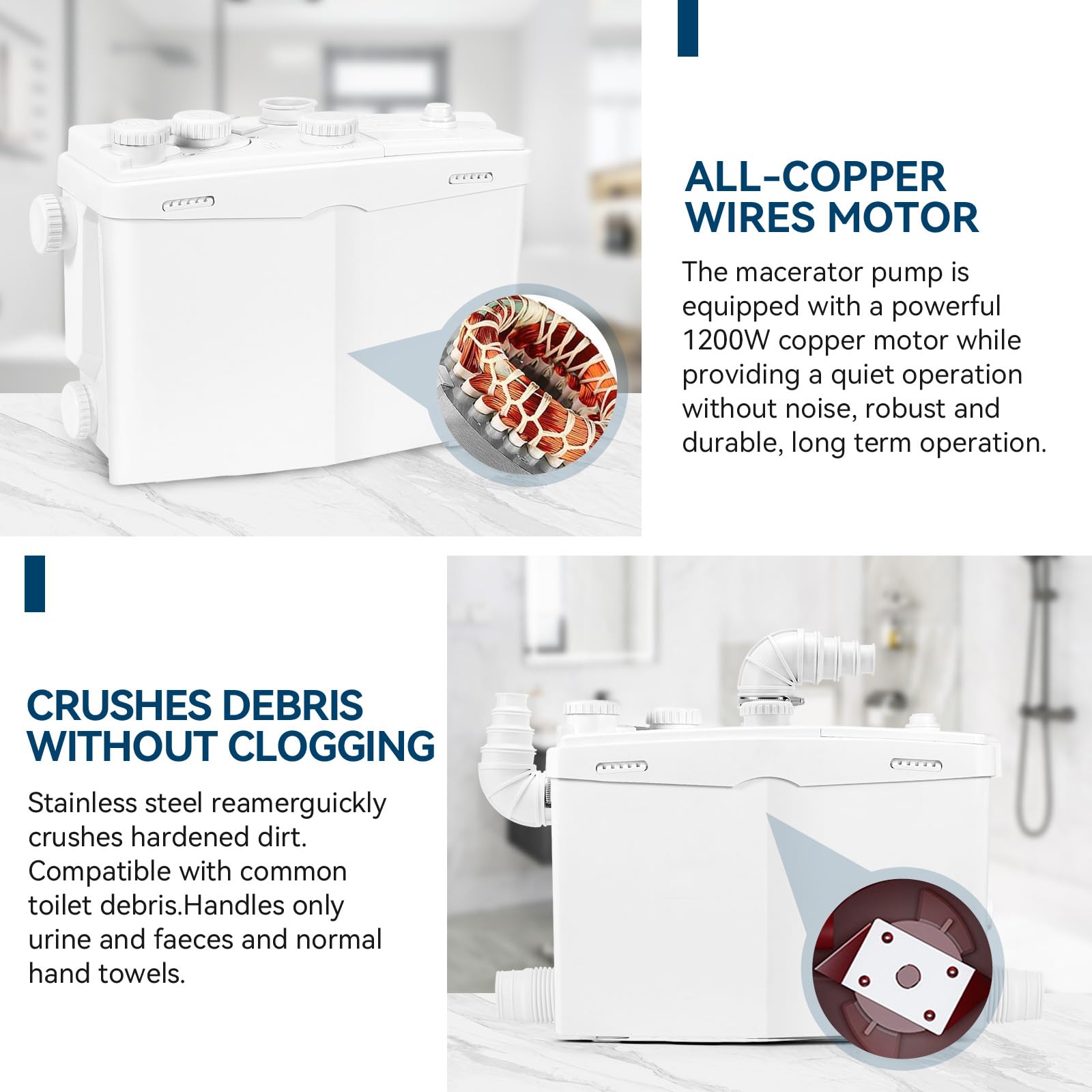 1200W Utility Sink Pump with Blade PCB Function Macerator Sewerage Sump Pump Upflush to 39.4FT 2800GPH with 4 Water Inlets 2 Outlets Drain for Sink Shower Laundry Washing Machine Kitchen Basement