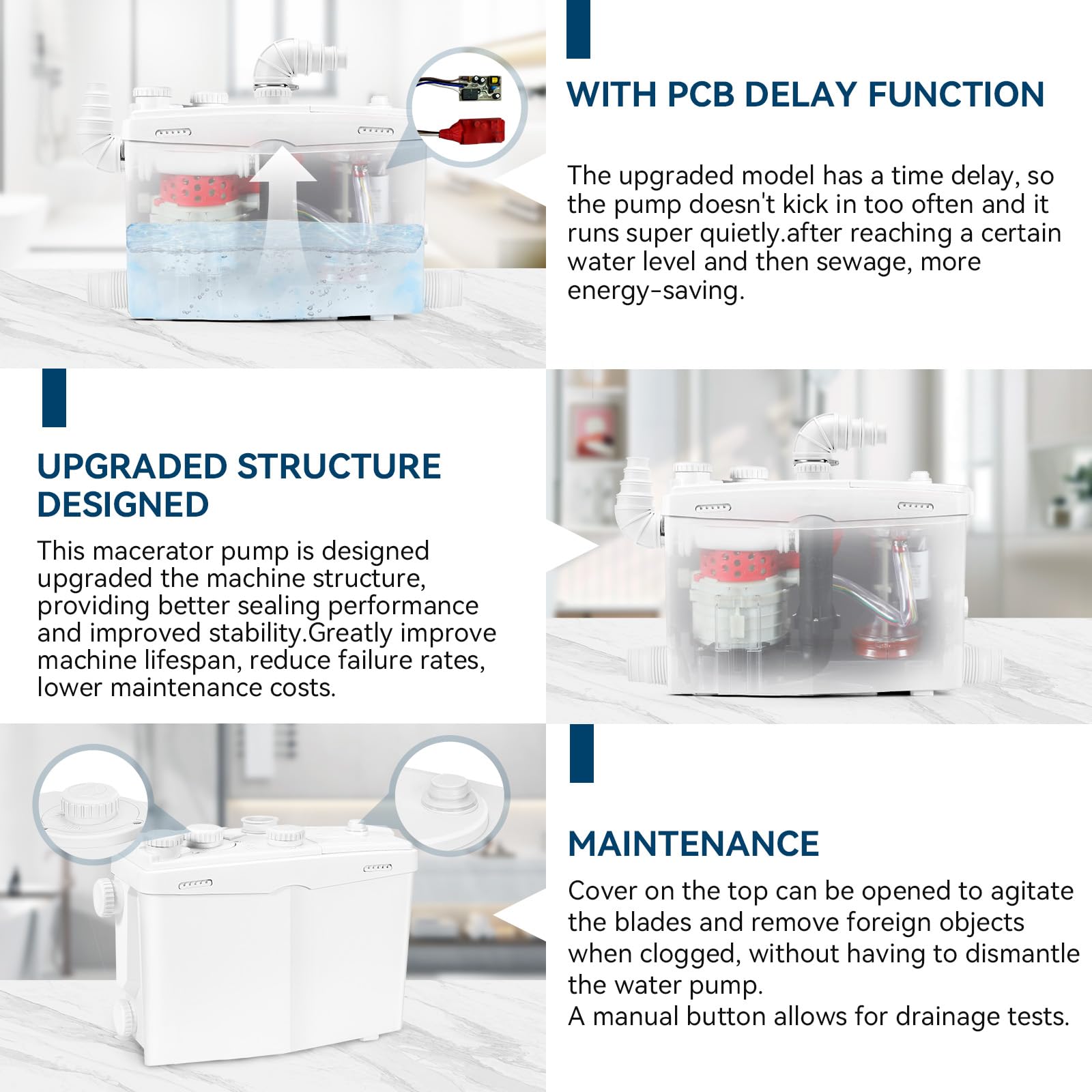 - MAINTENANCE : Cover on the top can be opened to agitate the blades and remove foreign objects when clogged, without having to dismantle the water pumpThis toilet sewerage pump is designed with an upgraded switch and Inside the machine structure, providing better sealing performance and improved stability. Greatly improve machine lifespan, reduce failure rates, lower maintenance costs, and ensure installation