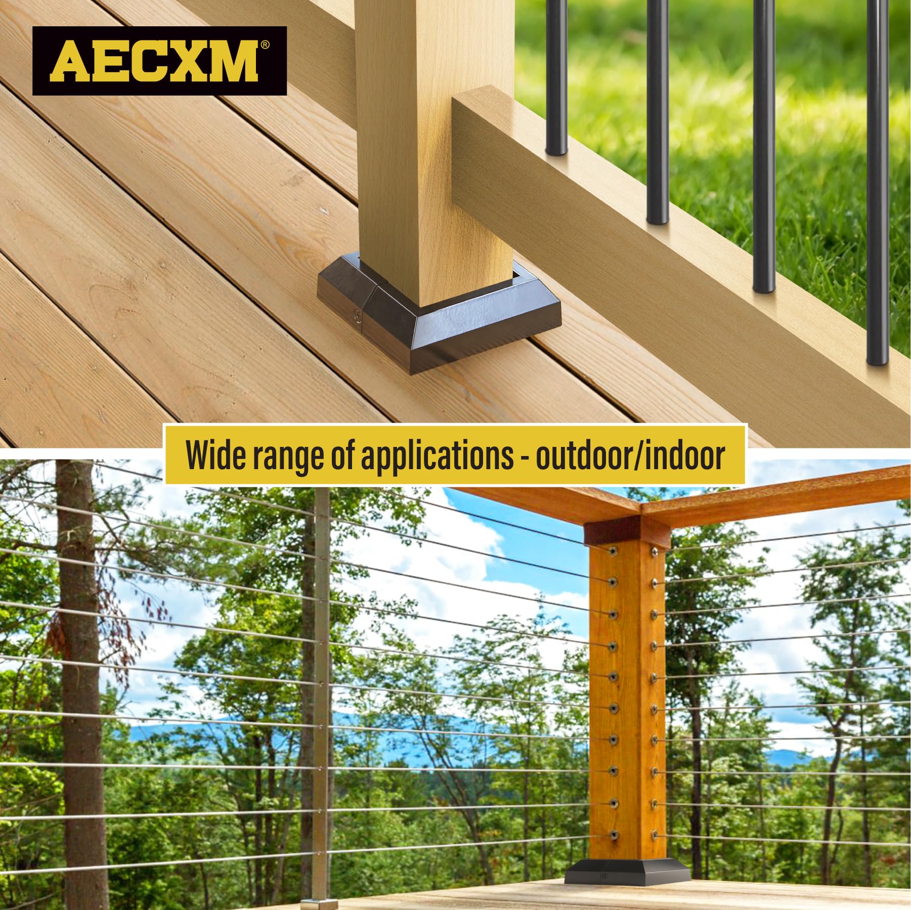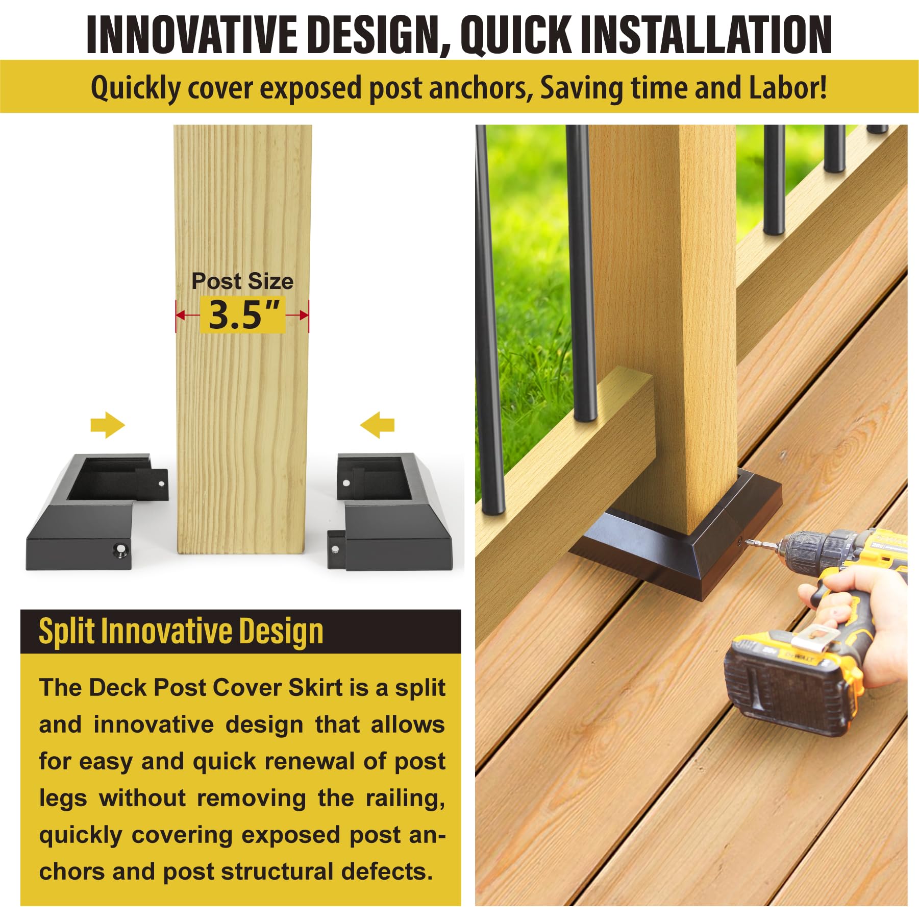 - INNOVATIVE DESIGN: The Deck Post Base Cover features a unique split design, Easily cover exposed post anchors or construction defects without pulling out the railing, saving time and costly repairs. Indoor/outdoor wood post base decorative covers are quick and easy to install, giving your deck railings, handrails, stairs, and porches a new, organized look.