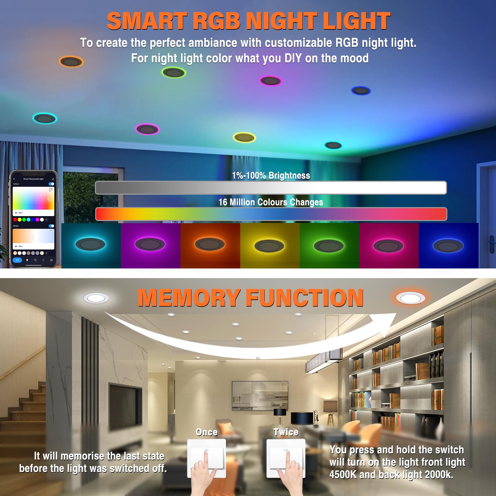 - Memory Function: Once: Smart ceiling lights will remember the last state of the light before it was switched off. Second : A long press on the switch will turn on the front light 4500K and the back night light 2000K. With the memory function, it can save you a lot of trouble in your busy life.It is easy and comfortable.
