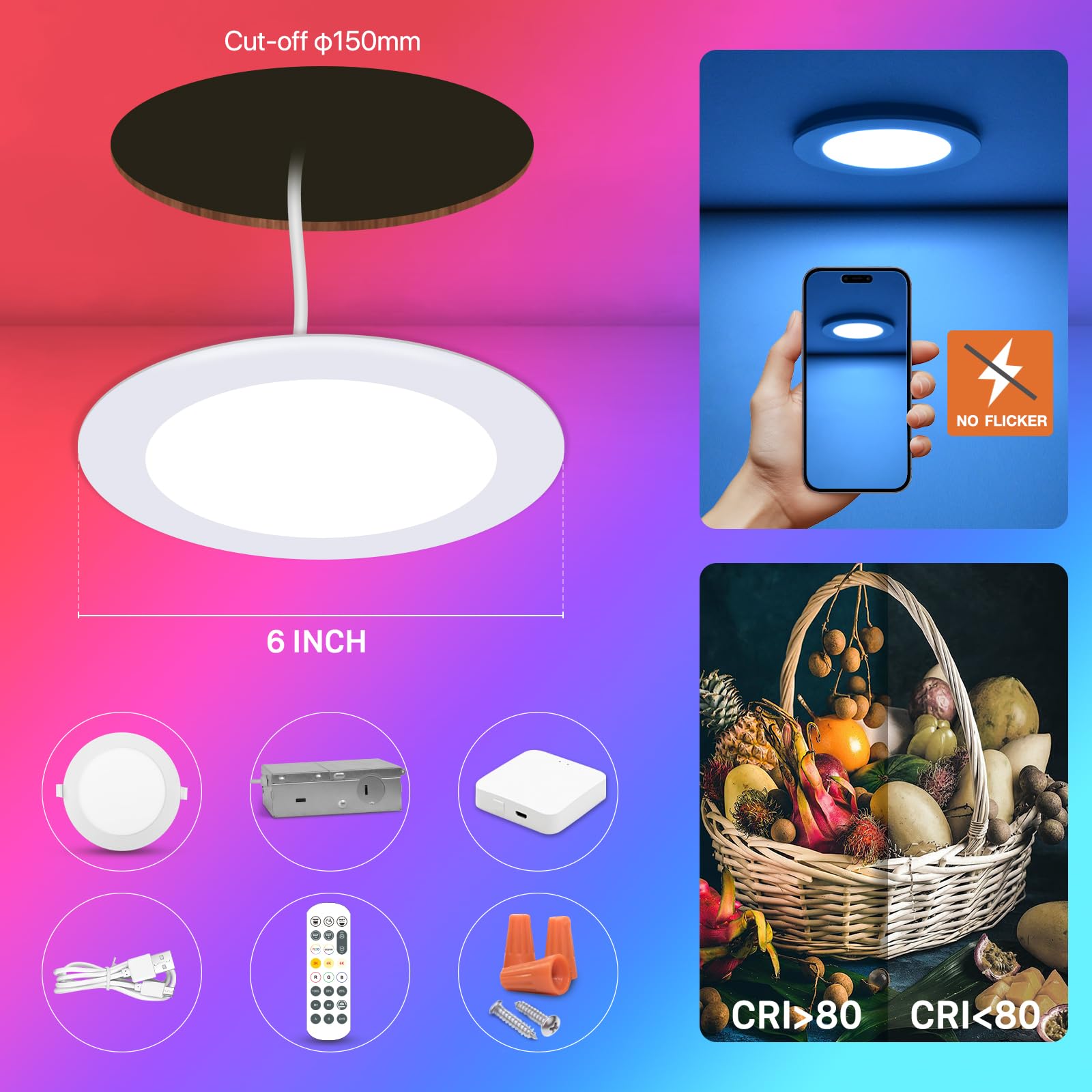 12Pack Smart RGB Recessed Lighting 6Inch,Ultra-Thin Canless LED Downlight, 2.4GHz Wi-Fi Bluetooth Direct Connect, 2700K-6500K,12W,1080LM,Work with Tuya App, Alexa,Google Assistant, Music Sync