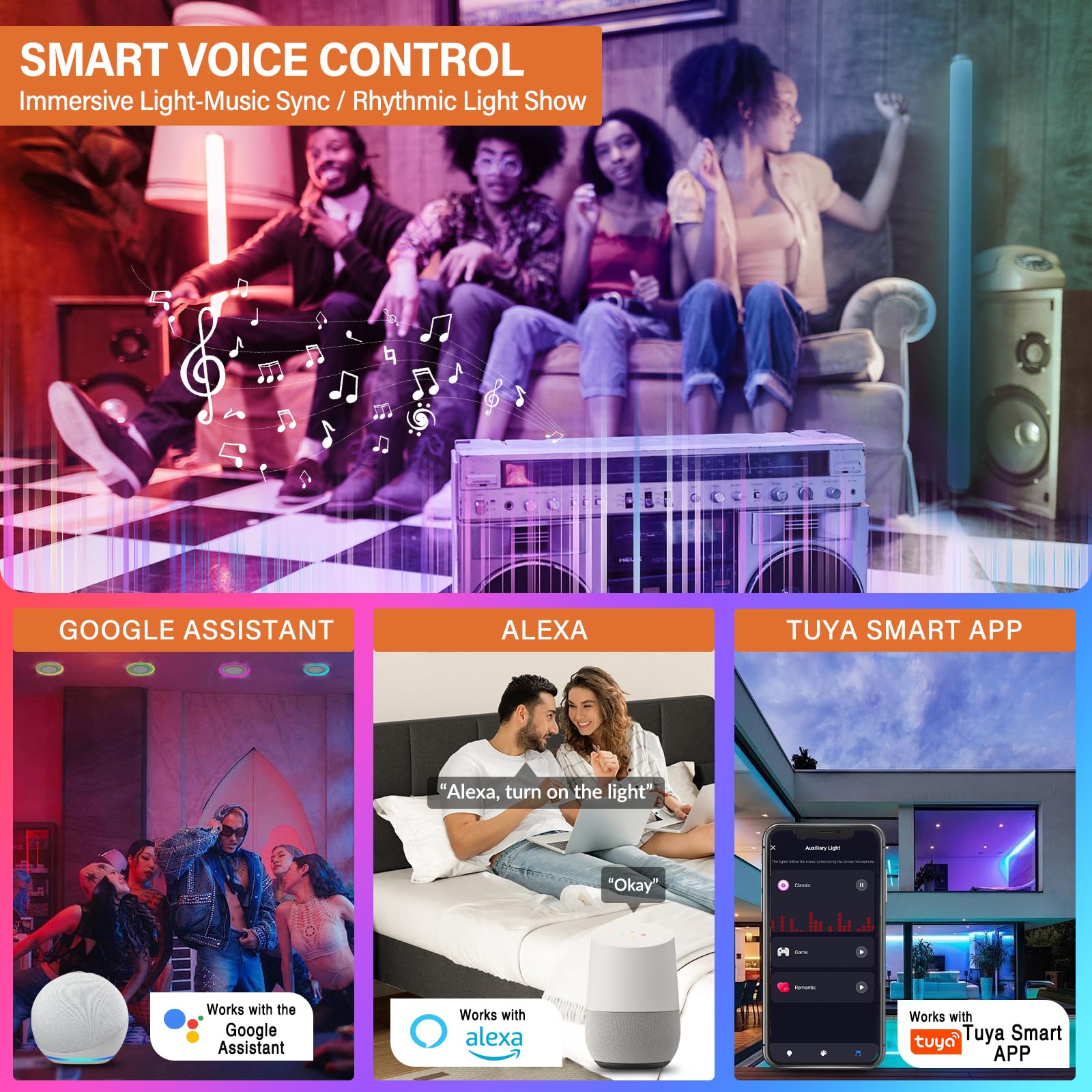 - Smart Voice Mode: The smart can lights can seamlessly connect with Alexa, Google Assistant, or Siri, allowing you to control power, brightness, and color settings via voice commands. Additionally, if you want to create a more ambient atmosphere at home, you can choose the music rhythm mode, which sets a special and relaxing mood.Whether you're hosting a party or having a personal concert, it will be a fantastic experience.