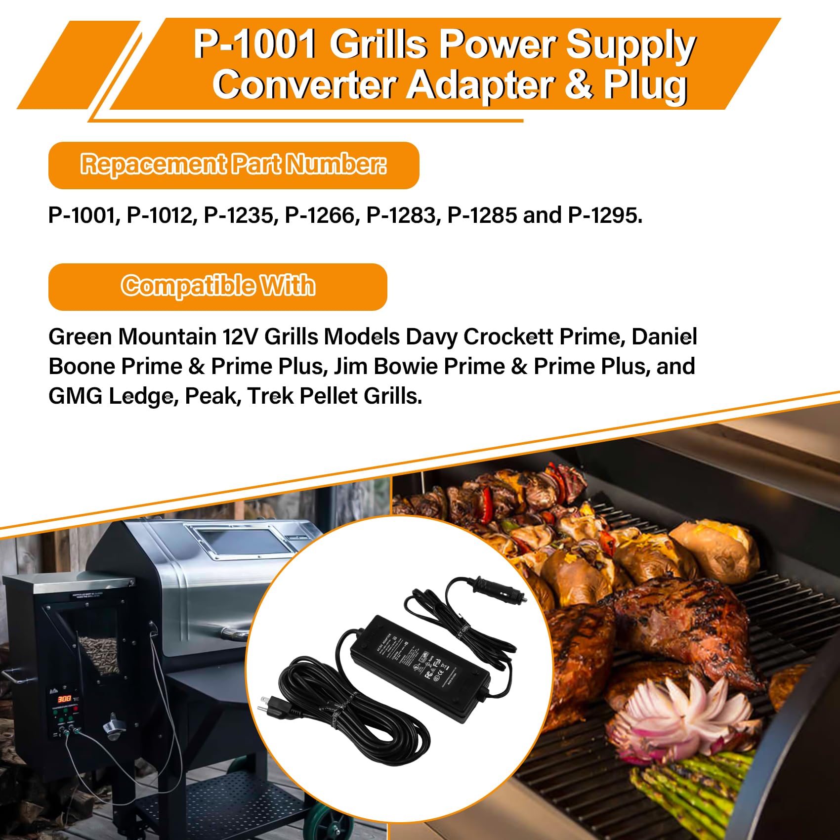 - 【Compatibility】: This Power Converter Adapter and Power Cord Combo Compatible with Green Mountain 12V Grills Models Davy Crockett Prime, Daniel Boone Prime & Prime Plus, and Jim Bowie Prime & Prime Plus, Ledge, and GMG Peak, Trek pellet grills, replacement part number: P-1001, P-1012, P-1235, P-1266, P-1283, P-1285 and P-1295.