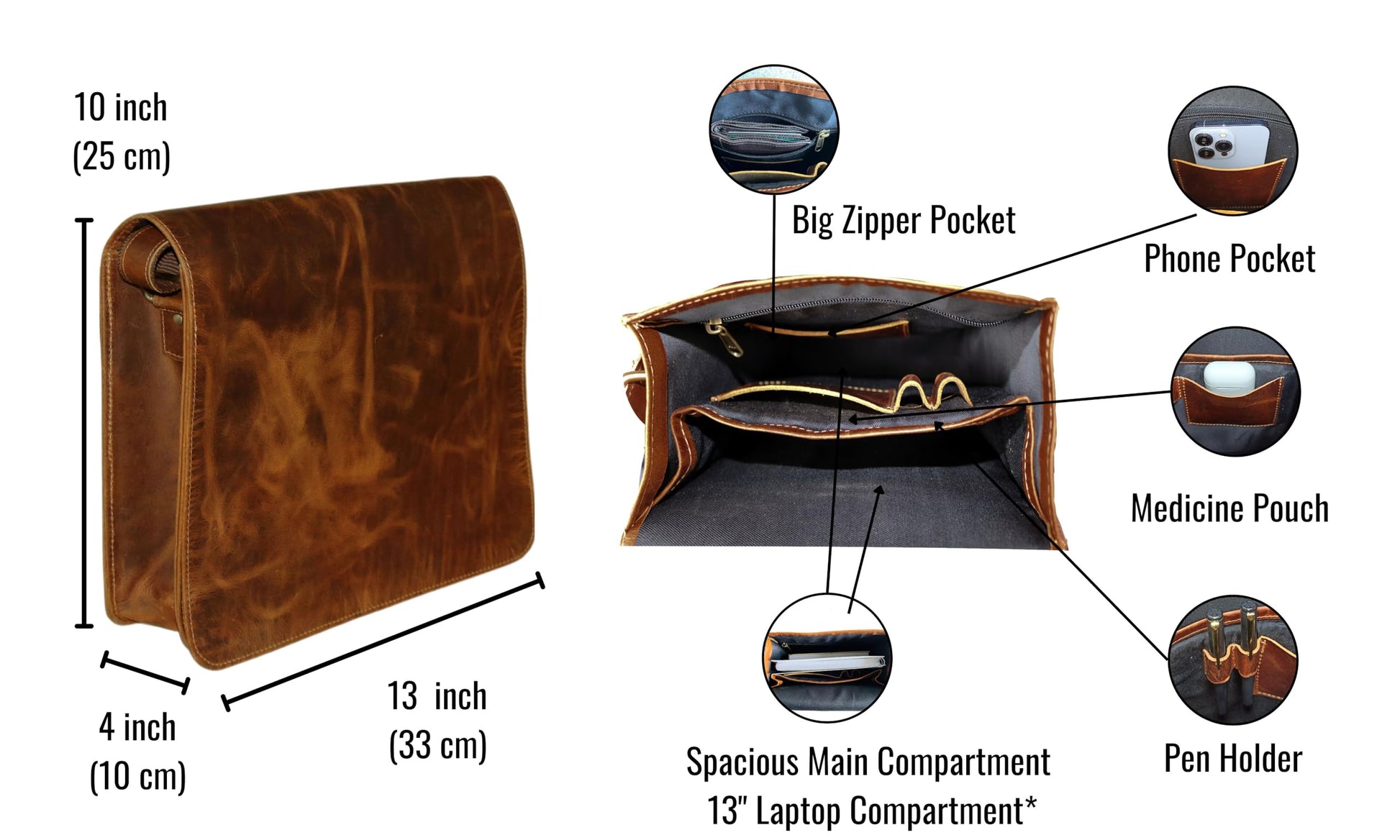 - Perfectly Sized: With external dimensions of 13" (33cm) in length, 10" (25cm) in height, and 4" (10 cm) in width our satchel strikes the perfect balance between compact and spacious, ideal for your college essentials, work materials, or in the metros.