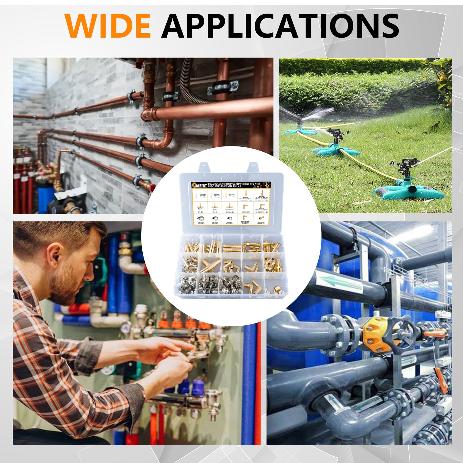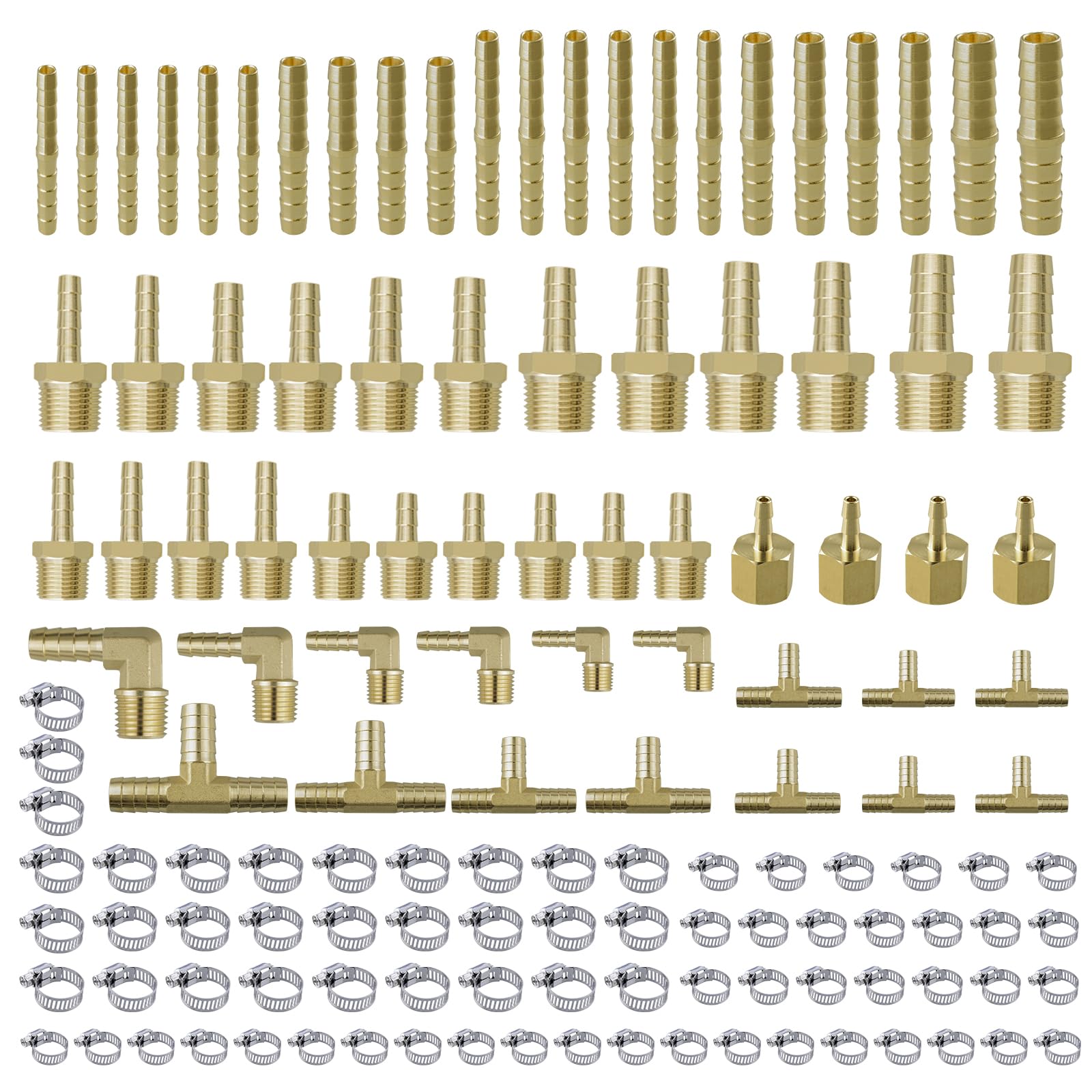 136Pcs Brass Hose Barb Fittings Assortment Kit Barb Splice/Female Adapter/Coupler/Tee/Male Elbow NPT Thread 1/8" 3/16" 1/4" 5/16" 3/8" 1/2" Air Hose Fittings with Pipe Clamps for Water/Air/Fuel