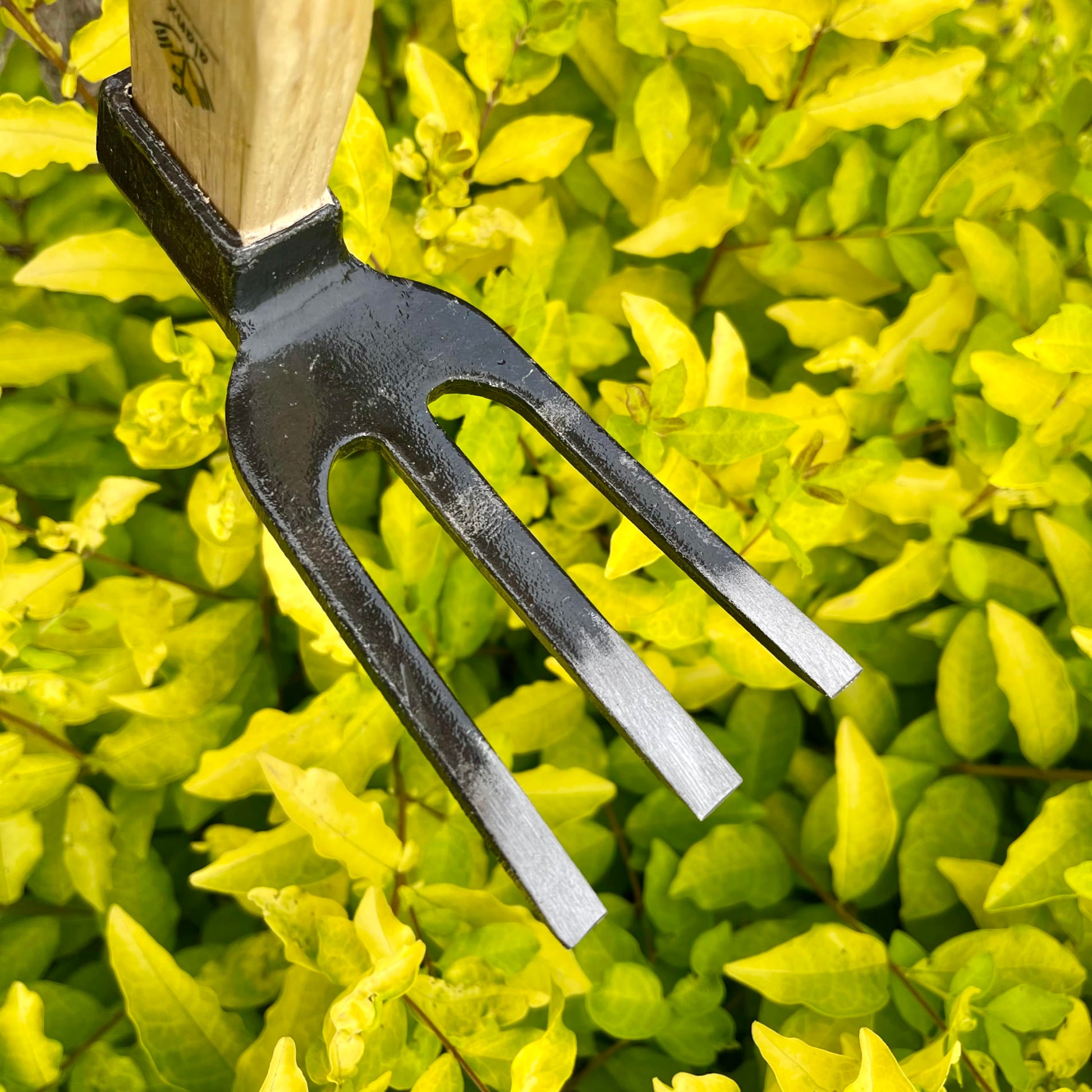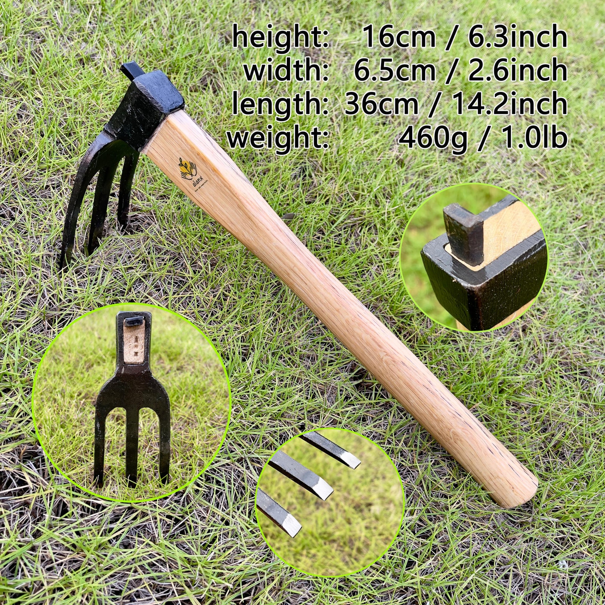 14 inch Japanese Hand Tiller/Rake for Garden, 3-tines Cultivator, Without Welding, Oak Handle, for Digging, Soil Preparation, Chopping Through Roots and Hard Soil and Other Gardening tasks