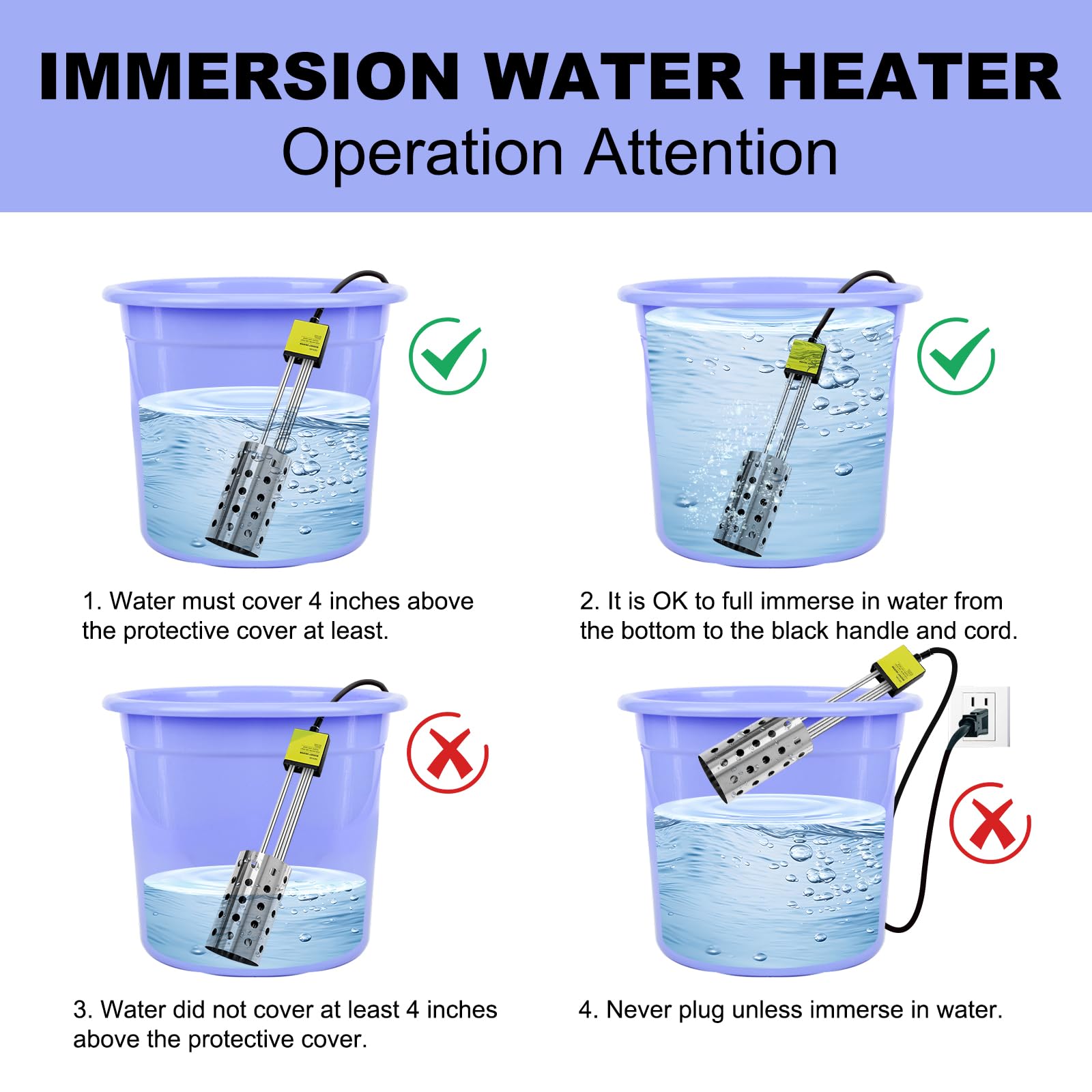 - Simple Operation - Immerse in water at proper level, plug into any grounded wall outlet, then it starts working. NOTE: water must cover 4 inches above the protective cover at least.