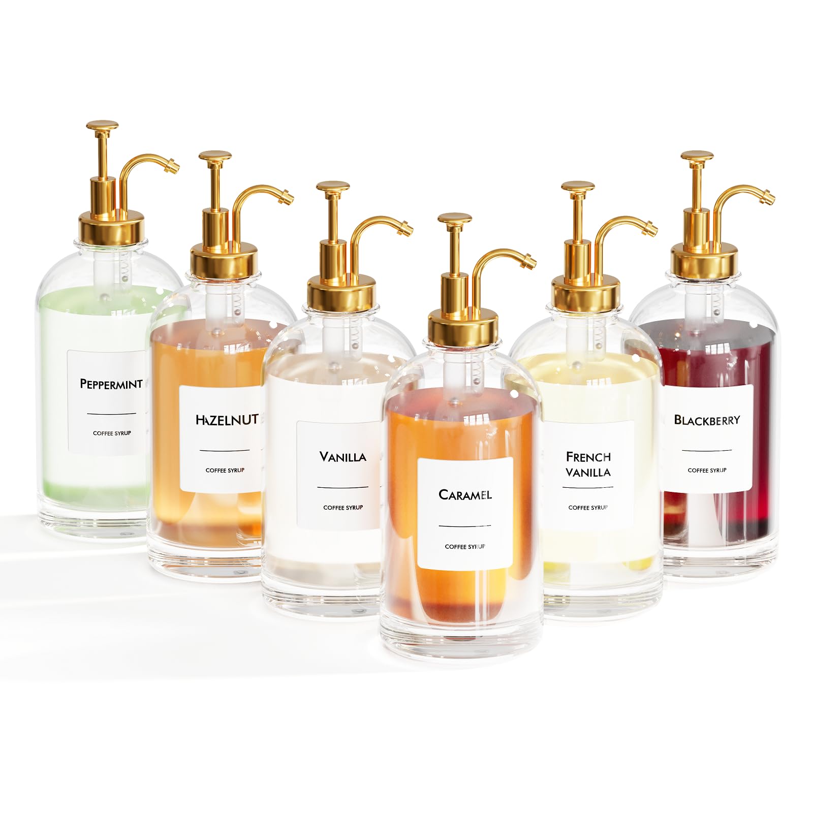16.9 oz/500 ml Coffee Syrup Dispenser Set - 6 Glass Bottles with Gold Pumper and Syrup Labels - Precise Dispensing and Stylish Addition to Coffee Shop, Cafe or Home Bar
