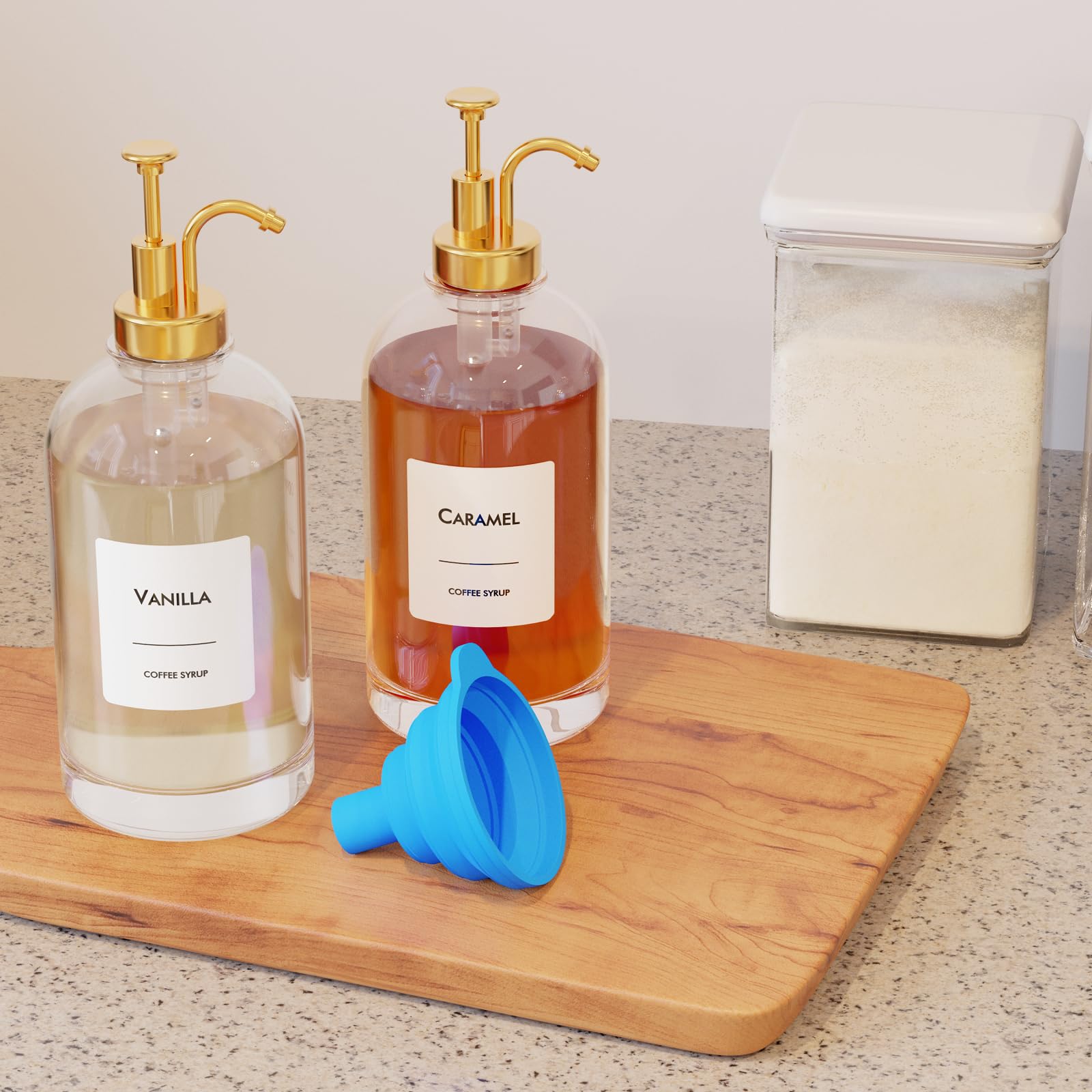 - Complete Coffee Syrup Dispenser Set: This set includes 6 high-quality glass bottles (16.9 oz/500 ml) with pumps, a funnel, and 28 syrup labels to keep your coffee bar organized and stylish.