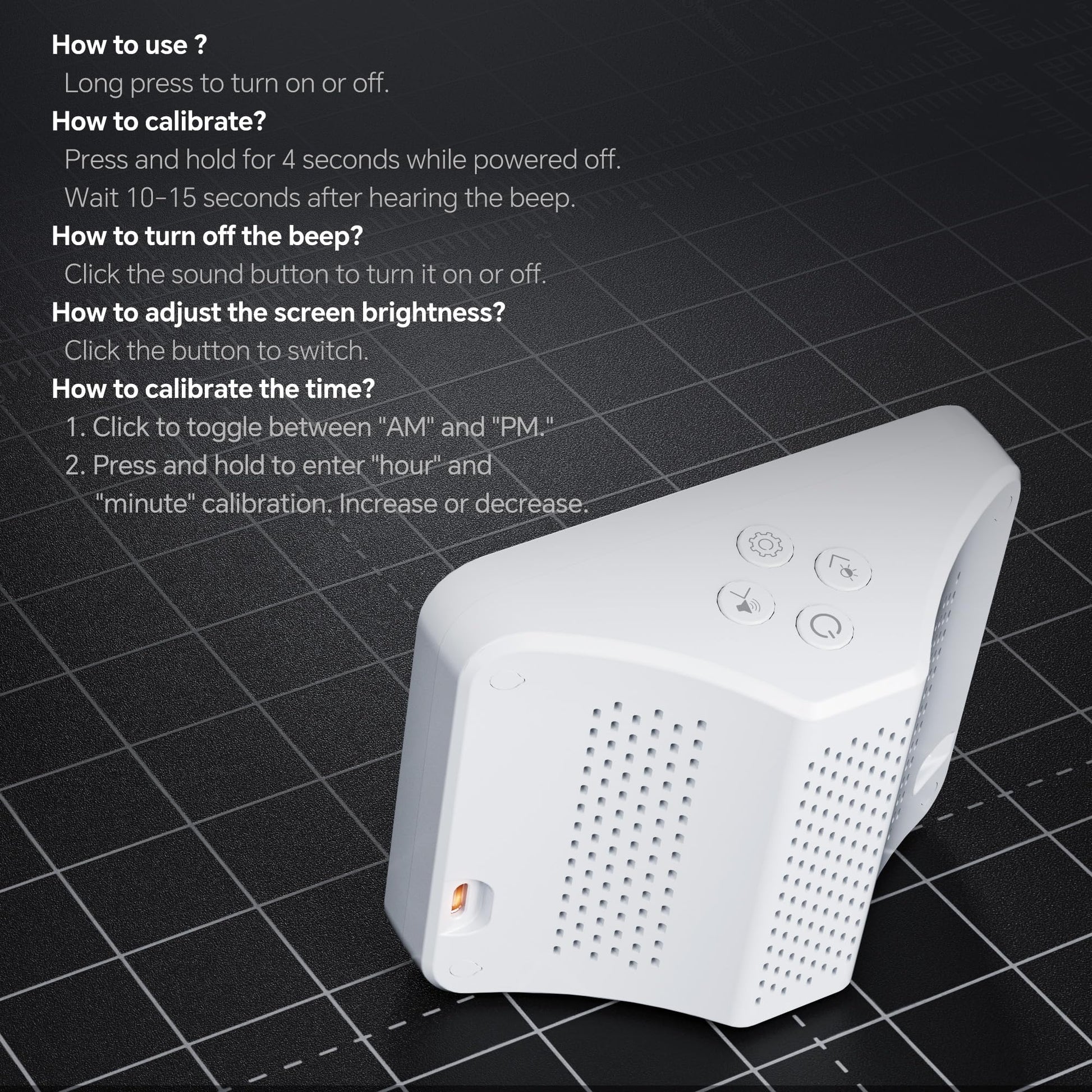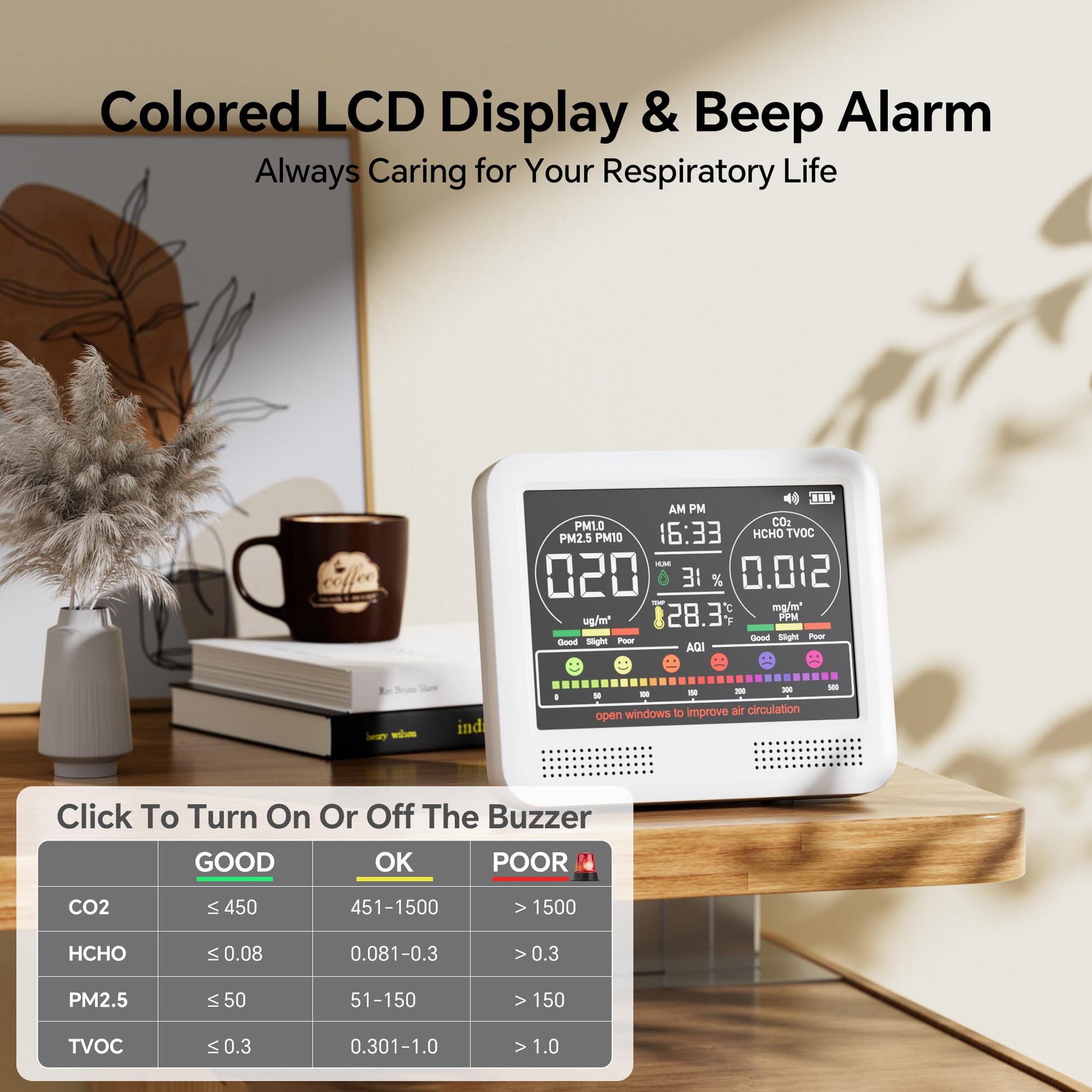 - [Intelligent Buzzer Alarm for Real-Time Alerts]: The built-in buzzer automatically sounds off with a distinct “BBB…” warning when any air quality parameter exceeds safe levels. This immediate alert system helps you react quickly to harmful changes. The sound can also be turned off manually, ensuring a peaceful environment during rest or sleep.