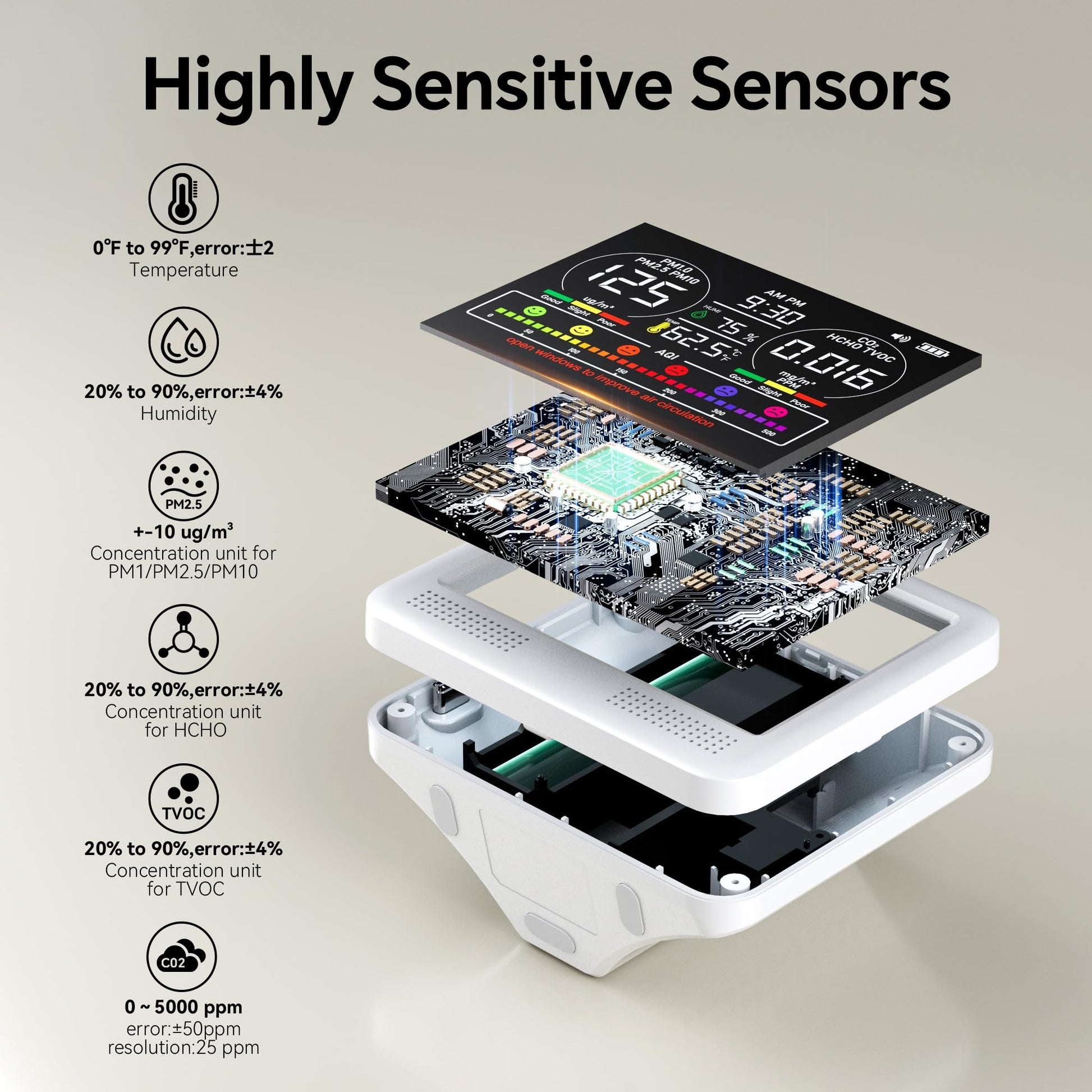- [All-in-One 16-in-1 Air Quality Monitoring]: This Air Quality Monitor Indoor offers a complete solution for tracking your environment. It accurately measures 16 essential air quality indicators, including CO2, PM1.0, PM2.5, PM10, temperature, humidity, formaldehyde (HCHO), and volatile organic compounds (VOCs). Resampling every 1.5 seconds, it provides real-time feedback, making it an ideal air quality tester for home, office, or any indoor space where clean air matters.