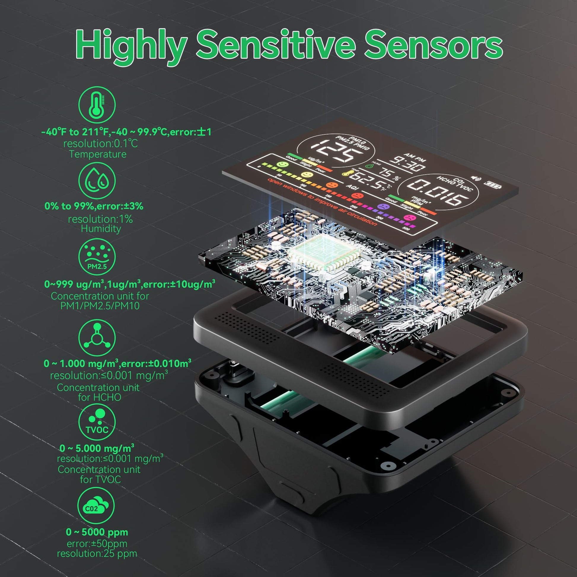 - [16-in-1 Multifunction]: This air quality monitor measures not only 7X AQI, but also CO2, temperature, humidity, formaldehyde (HCHO), volatile organic compounds(VOC), PM1.0, PM2.5, and PM10. It combines multiple functions to comprehensively monitor various air quality parameters, resampling every 1.5 seconds to provide real-time data and continuously protect your every breath.