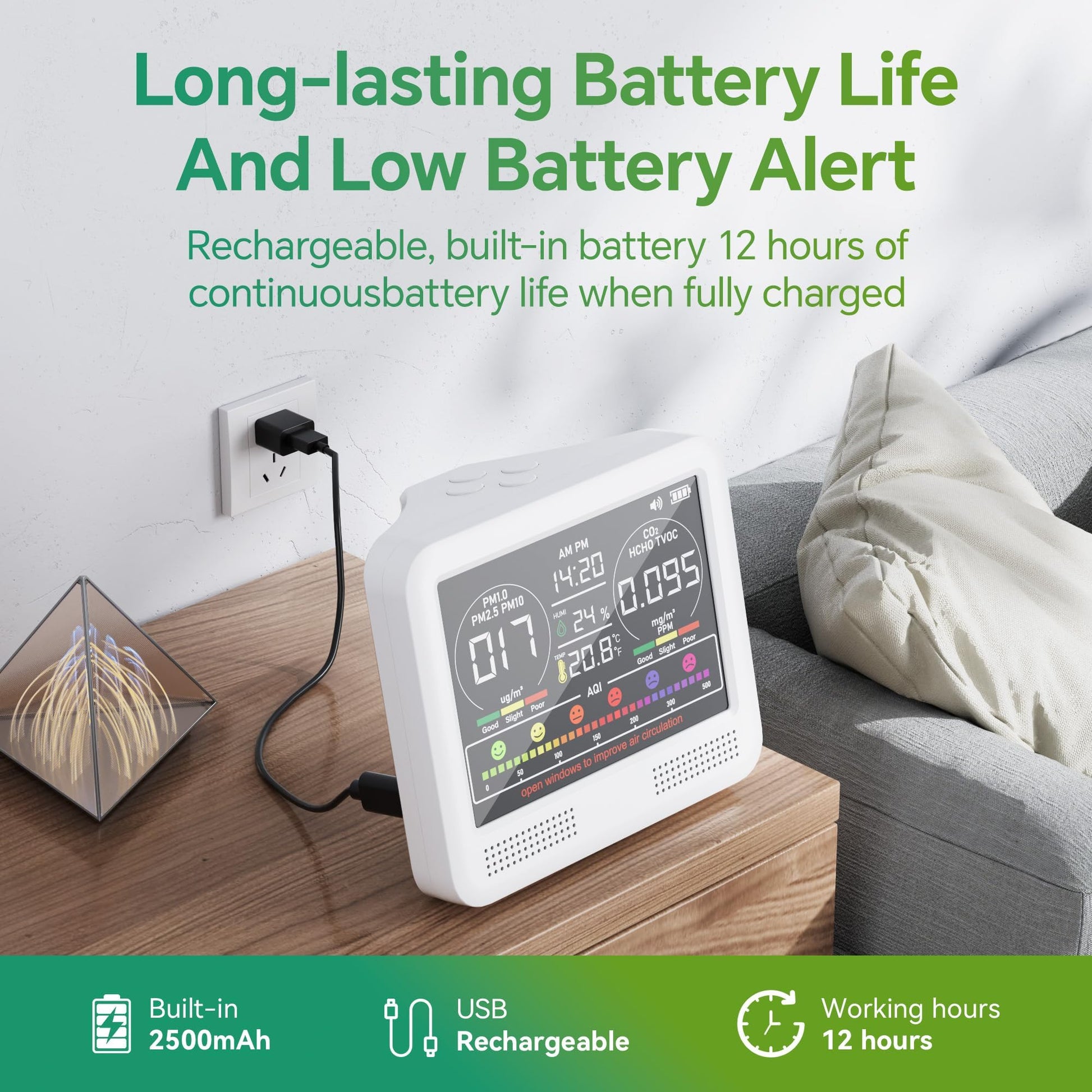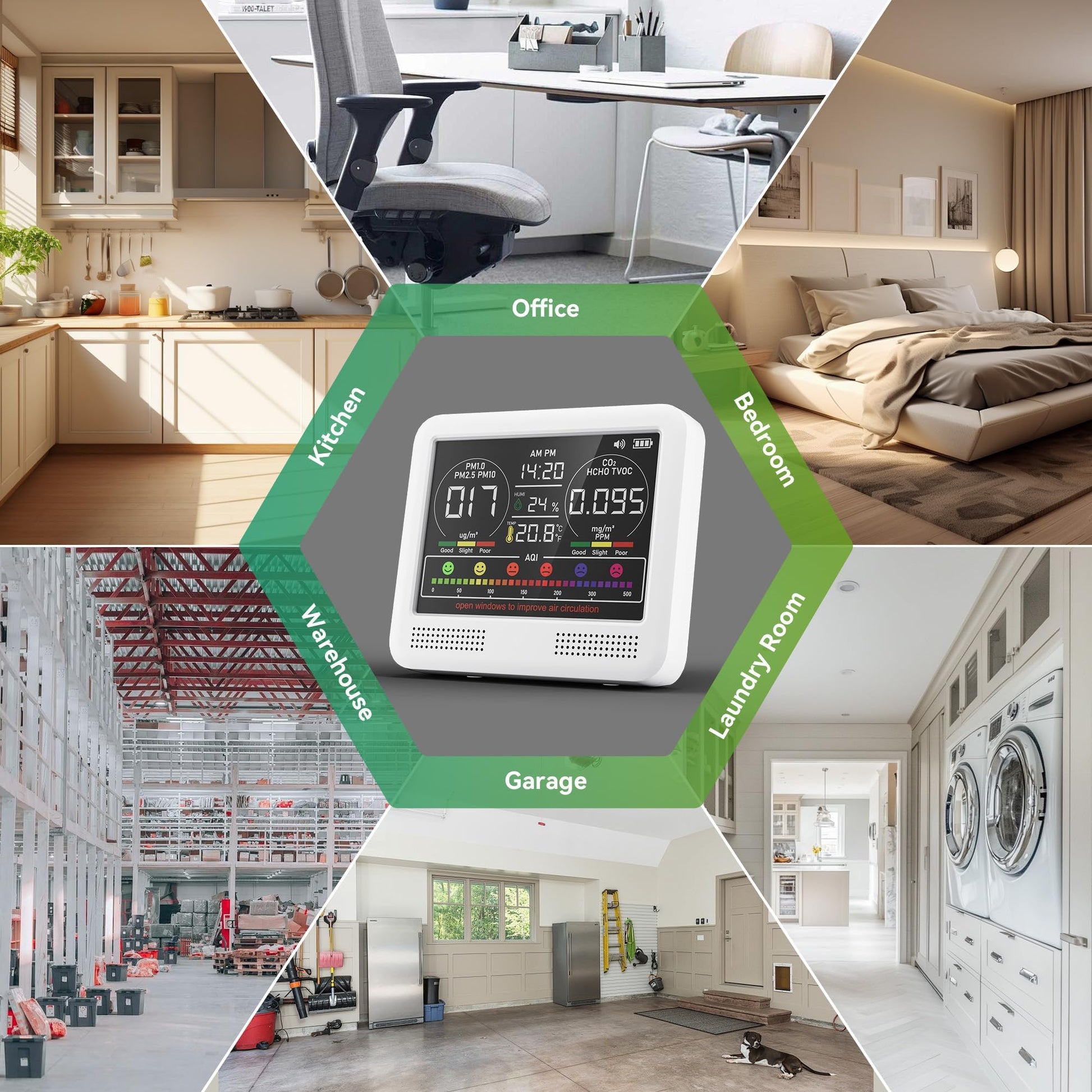 - WIDE APPLICATION: With its compact and convenient design, this indoor air quality tester easily adapts to various usage scenarios. Whether in the bedroom, study, kitchen, office, car, school, hotel, bar or campground, this device can accurately monitor air quality. It is suitable for home environments, car interiors, children's rooms, mother and baby rooms and other public spaces, ensuring you enjoy fresh and healthy air in different environments.