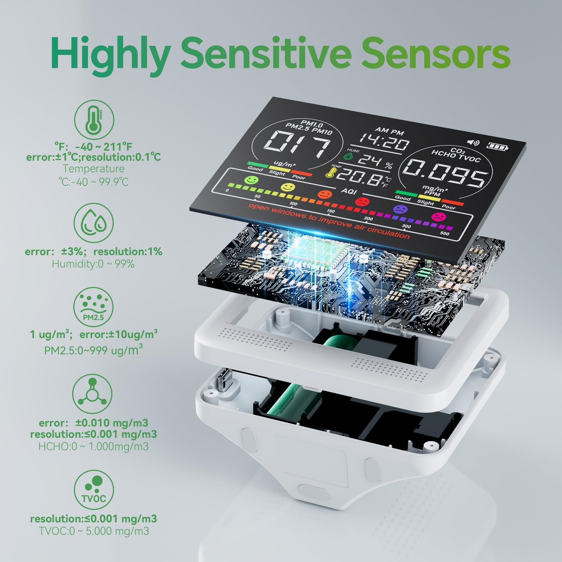- 16 IN 1 MULTIFUNCTIONAL AIR QUALITY METER: This air quality monitor measures not only 7X AQI, but also temperature, humidity, formaldehyde (HCHO), volatile organic compounds(VOC), PM1.0, PM2.5, and PM10. It combines multiple functions to comprehensively monitor various air quality parameters, resampling every 1.5 seconds to provide real-time data and continuously protect your every breath.