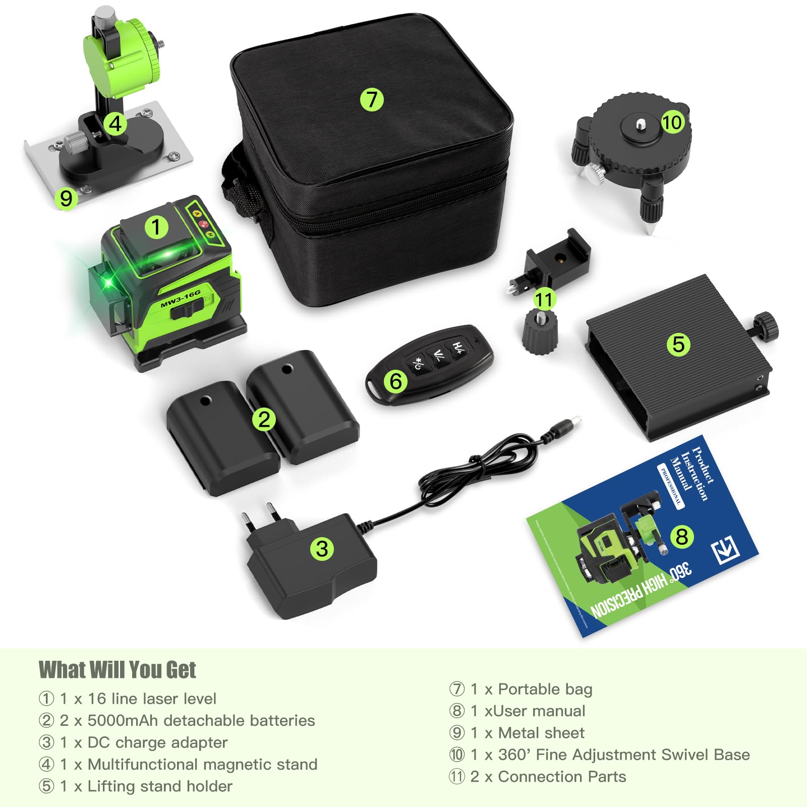 - 【Durable Design/Packaging List】IP54 waterproof/dusterproof to ensure that you can work normally and stably under complex working conditions. 1x 4D 16 Lines Laser Level, 1x Carry Bag, 1x Power Charger, 1x 1/4”Tread Mount, 1x 5/8-20" Tread Mount, 1x Wall Iron, 1x User Manual, 1x Remote Control, 1x Green Target Plate, 1x Wall Bracket, 1x Lifting Platform, 2x 2400mAH Batteries.