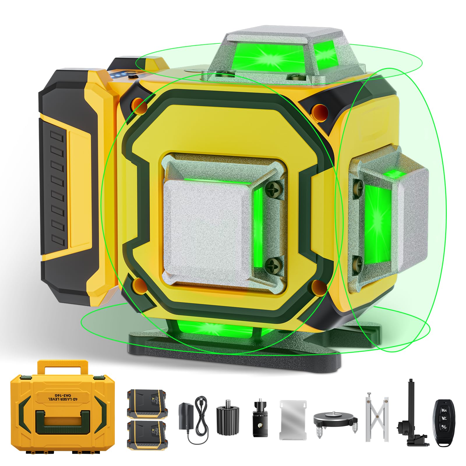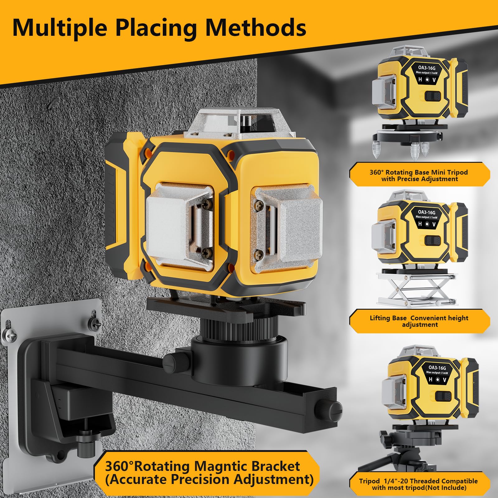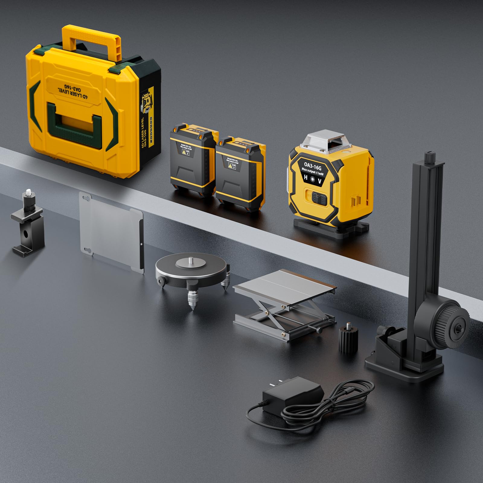 - 【Durable Design and Kit Contents】16 line laser level with IP54 waterproof/dustproof to ensure that you can work normally and stably under complex working conditions,A durable portable hard carry case is included for easier carriage and storage. The package contains 1x16 Lines Laser Level ,1 hard carry case, 1x Charger with Type-C charging cord, 1x magnetic bracket, 1x 5/8-20" Tread Mount, 1x Wall panel, 1x User Manual, 1x Remote Control, 1x Lifting base,1x Mini Rotary base, 2 Batteries.