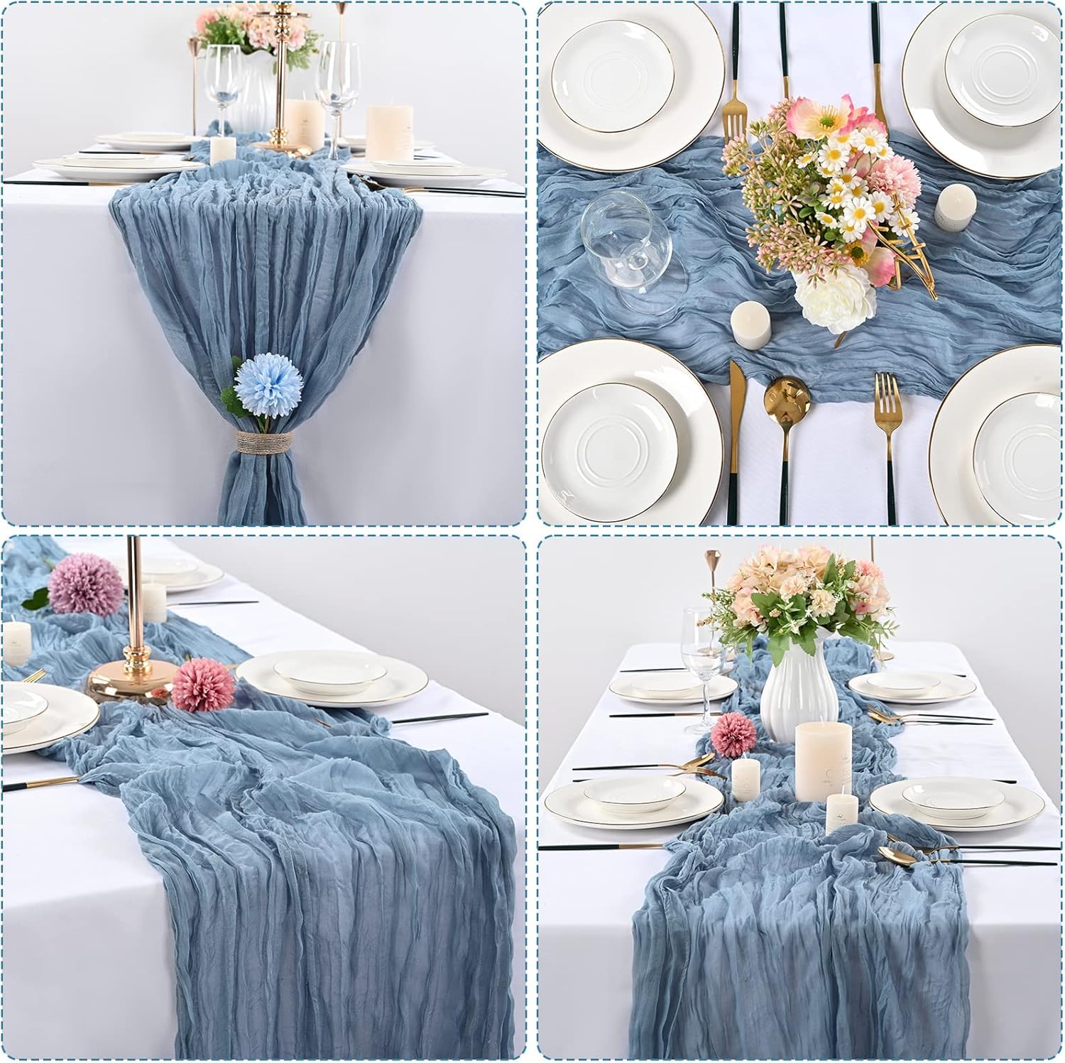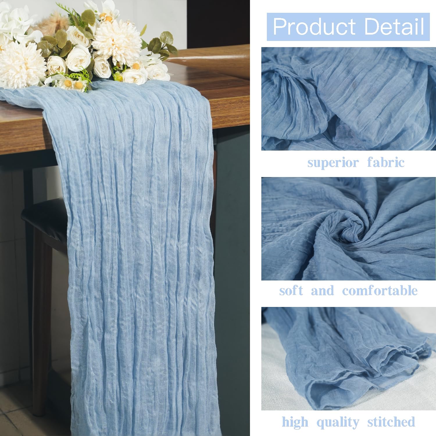 - Multipurpose Table Runner: This blue cheesecloth table runner features a gorgeous folded edge design for an elegant look and creates a vintage home decor look. Great for wedding decorations, country weddings, birthday parties, dinner parties, Valentine's Day, Thanksgiving, Christmas and other celebratory occasions. The tablecloth is not easy to warp or fade, no ironing is needed to keep the pleated texture, please feel free to wash and use it again and again.