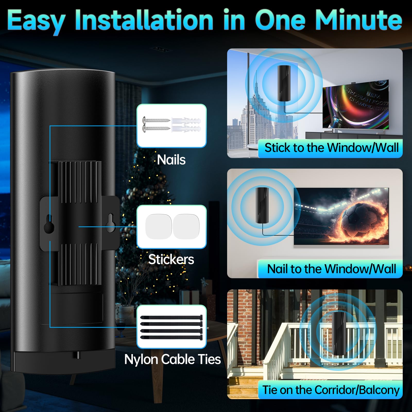- 1600+ MILES LONG RANGE RECEPTION: Our digital antenna for smart tv indoor adopts advanced technology to ensure optimal signal transmission protection, effectively preventing interference from external signals. Covering range up to 1600+ miles and supports 360°omnidirectional signal reception, allowing you can get more channels even you are far away from broadcast towers.