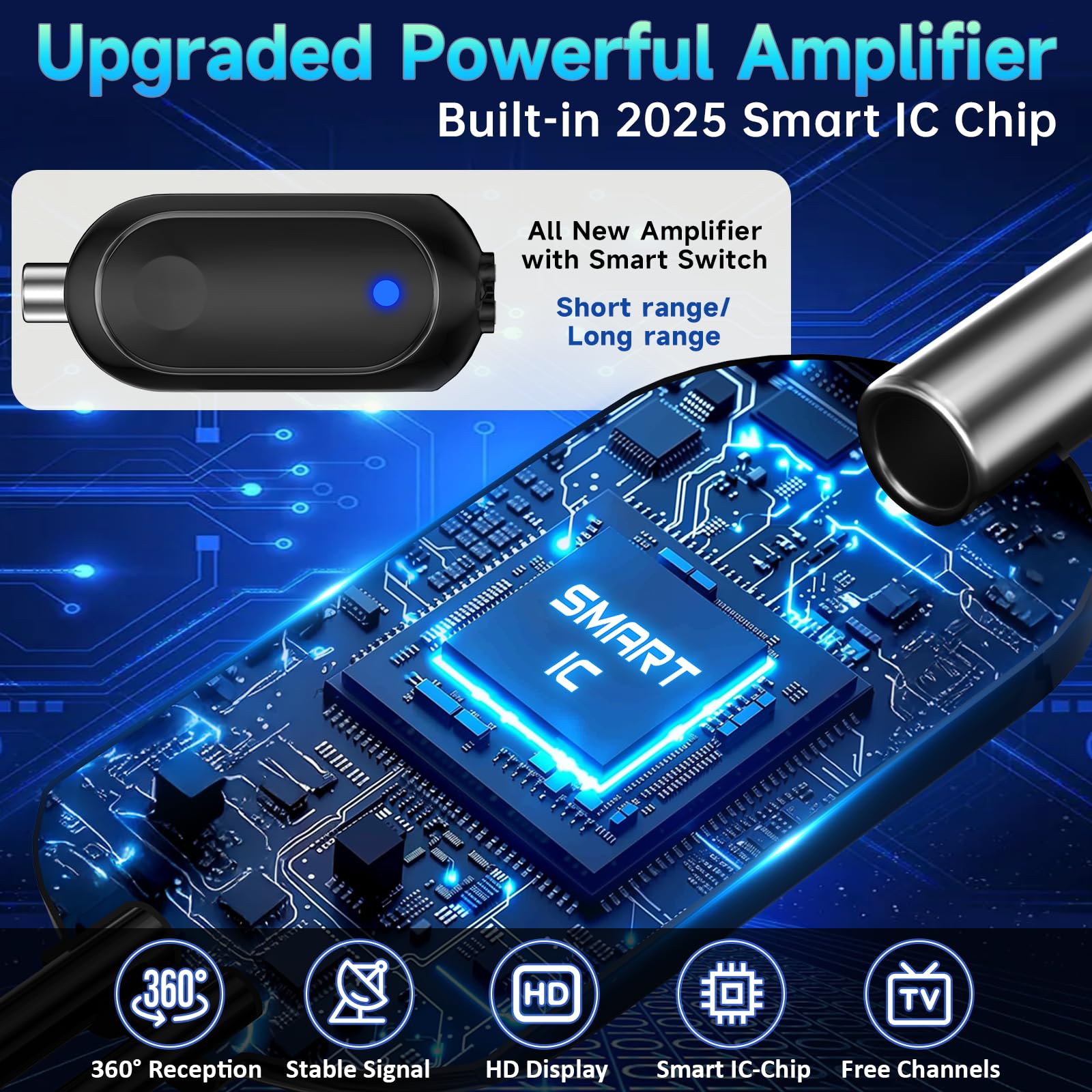 - 2025 NEWEST STRONGEST AMPLIFIER: PGOFBUO tv antenna for smart TV indoor has adopted 2025 newest strongest amplifier which built in Smart IC Chip, not only get instant and steady signals, but also make enjoy all free local channels in crystal clearer picture!